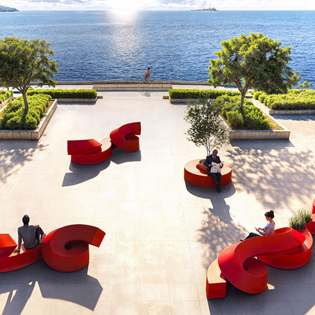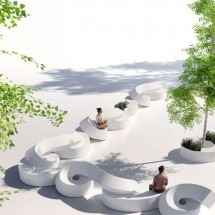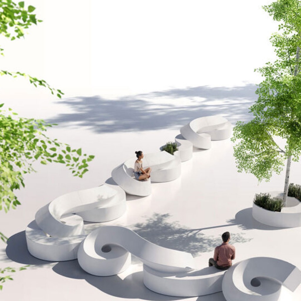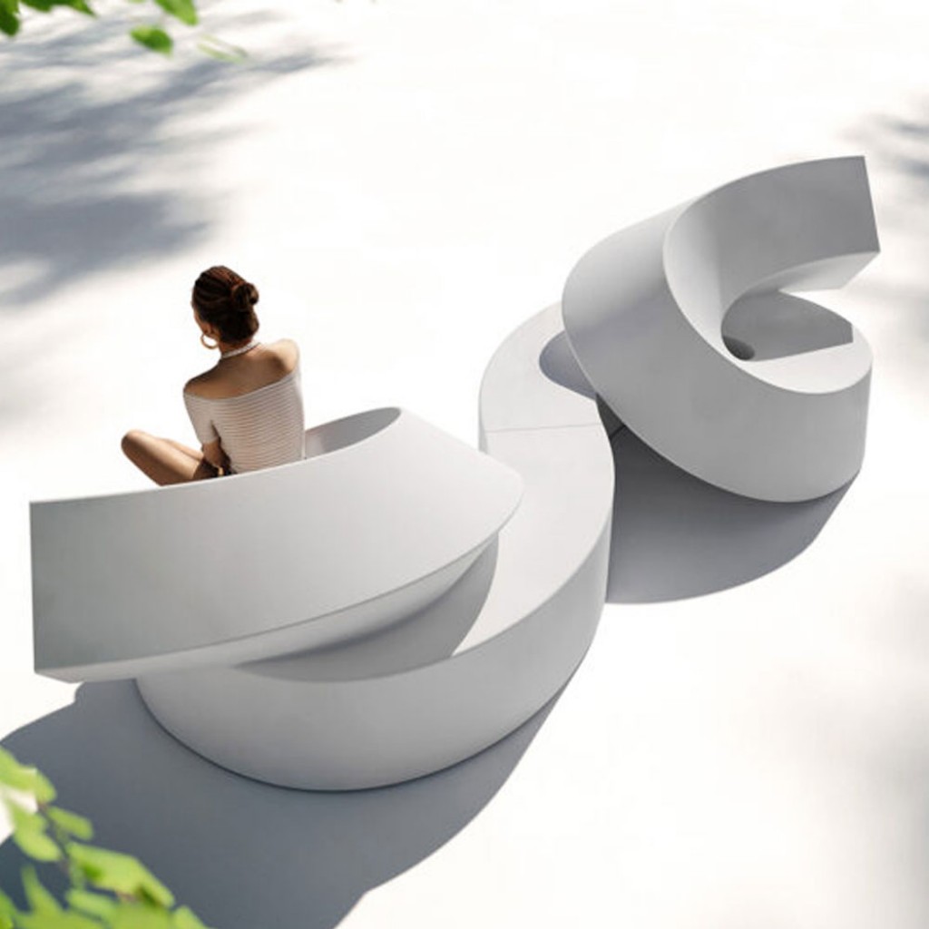 Banca Twist are o forma curbata si compacta, integrandu-se perfect in compozitii complexe din familia Twist, actionand ca element de legatura intre modulele curbate si jardiniere. Profilul geometric si curat urmareste fluent dinamica ansamblului, contribuind la crearea unui traseu funcional si armonios. Banca este disponibila si ca piesa independenta, fiind potrivita pentru zone publice, holuri sau medii contractuale, unde este necesara o solutie de sedere eleganta si discreta. Sistemul modular Twist creeaza o compozitie sinuoasa, care invita utilizatorii sa se aseze si sa se relaxeze.