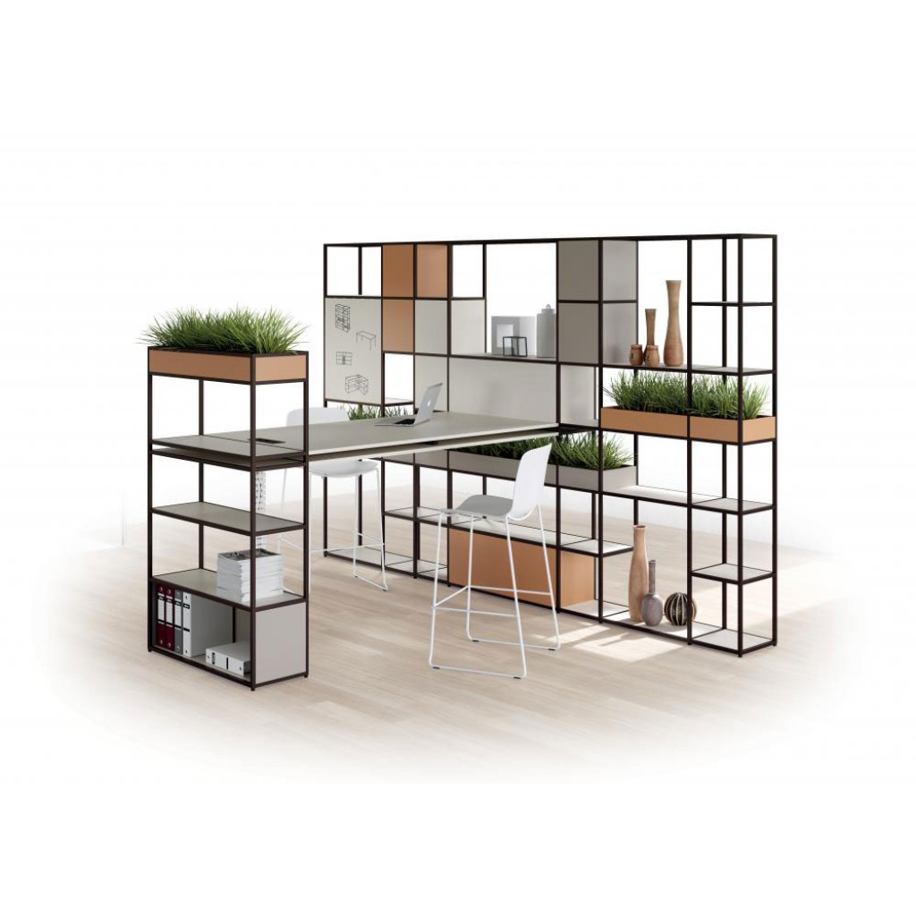 Q18 este o solutie modulara, cu o structura din aluminiu tubular de 18 mm, alaturi de care sunt integrate panouri si module de depozitare. Sistemul inteligent de fixare combina piesele din aluminiu. Piesele fac din acest produs un birou elegant si curat, fara suruburi la vedere.
