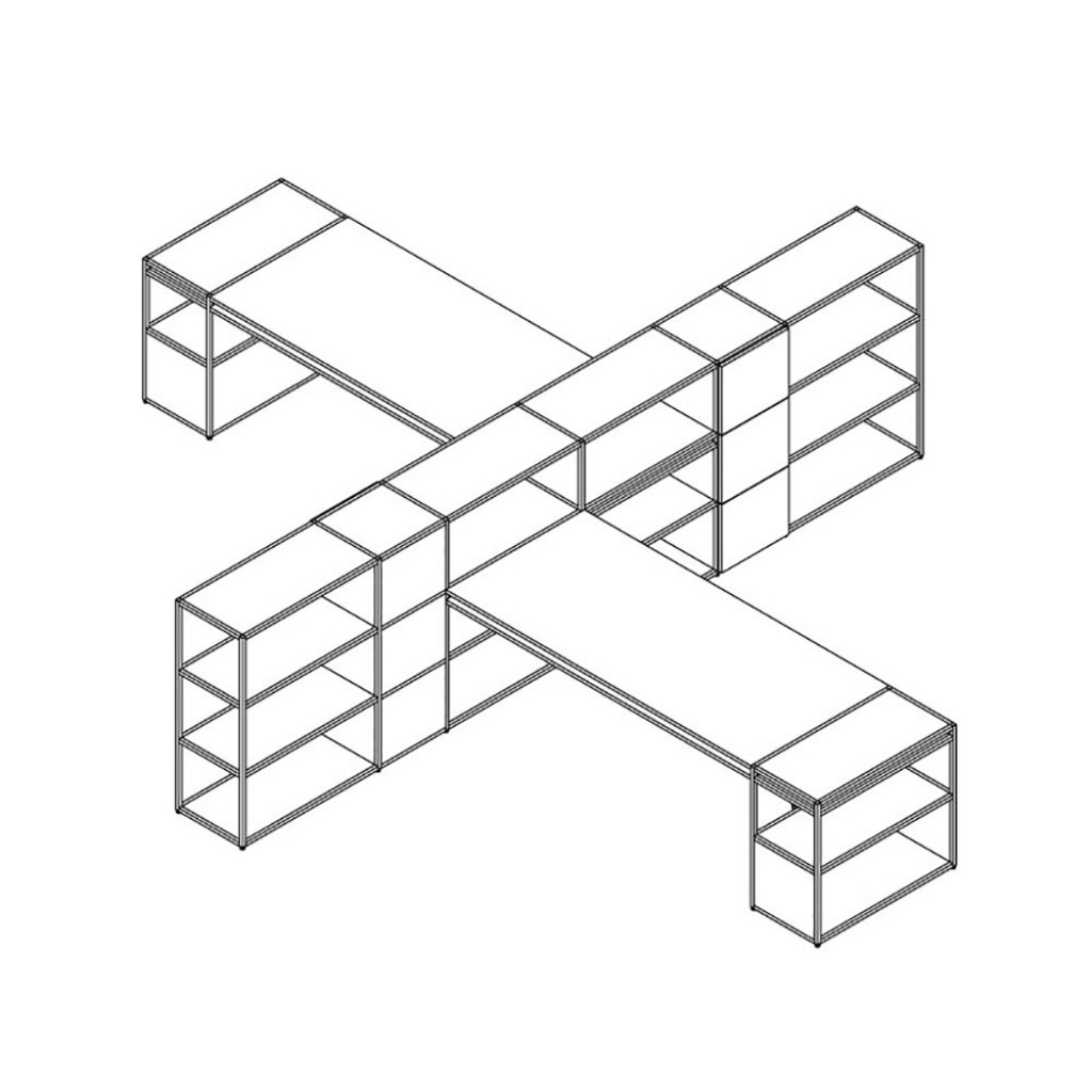 Un sistem de rafturi inovator si dinamic, cu un design neconventional, cu rafturi liniare si curbate care se intersecteaza armonios cu o structura eleganta din tuburi metalice. Modularitatea.. -