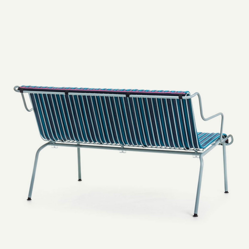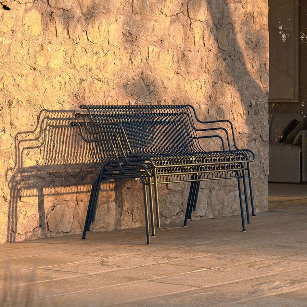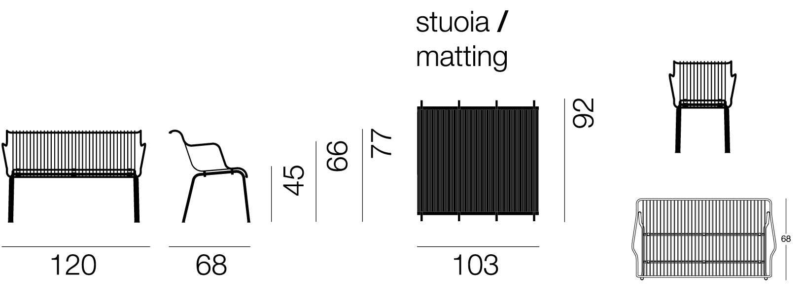 Canapea stivuibila. Materiale: tub de otel si sarma de otel, tratate cataforetic si vopsite cu pulbere de poliester. Picioare pivotante. Potrivita pentru utilizare in exterior. Disponibila si covoras tesut.