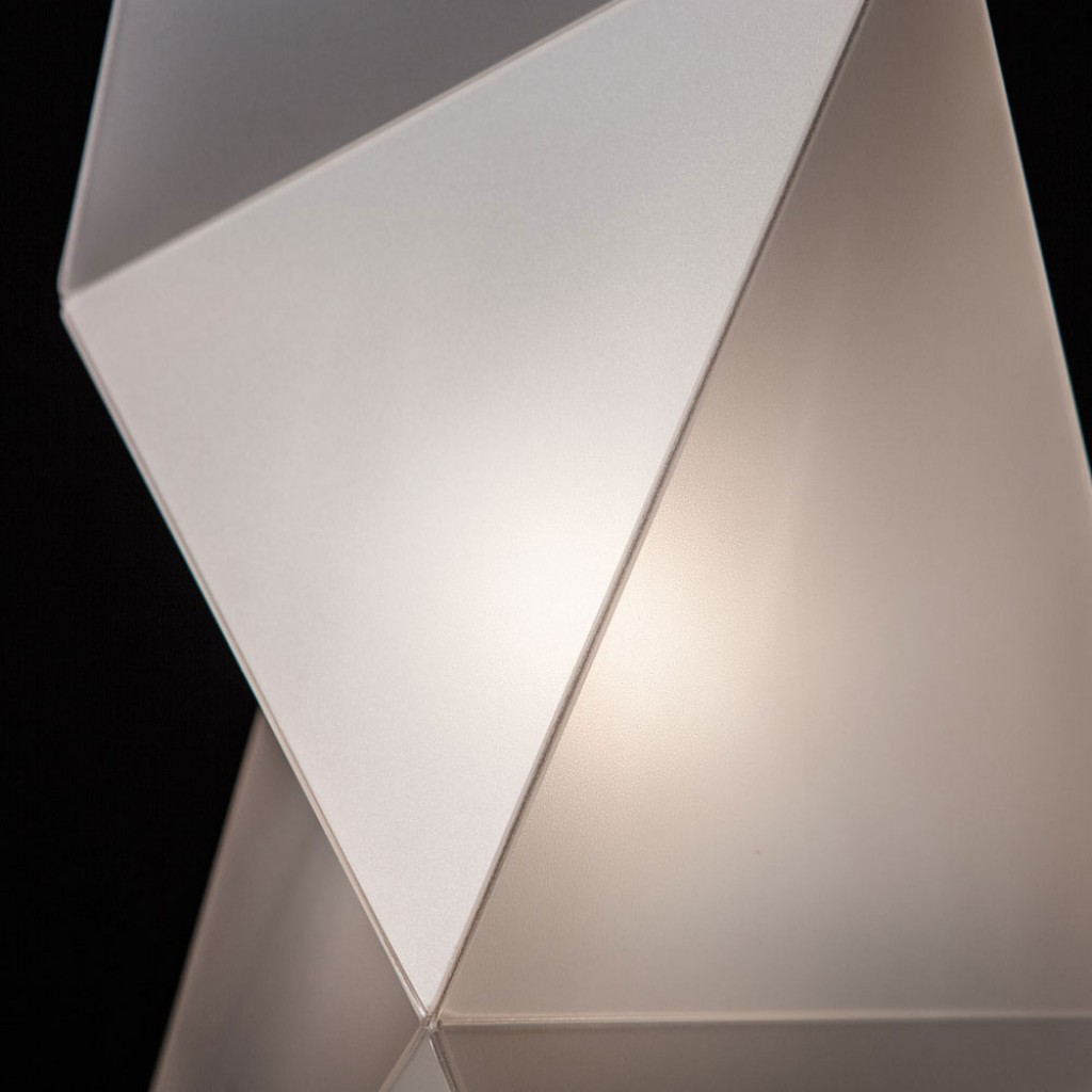 Sculpturala, dinamica si moderna, inspirata de opera iconica a lui Brancusi. Designul geometric al lui Diamond permite luminii sa accentueze fatetele si unghiurile sale diferite. Sculptura luminoasa este disponibila in trei dimensiuni, fiecare situandu-se in zone diferite, de la noptiere pana la camere de zi, iar cand sunt grupate, ele creeaza instalatii interne.