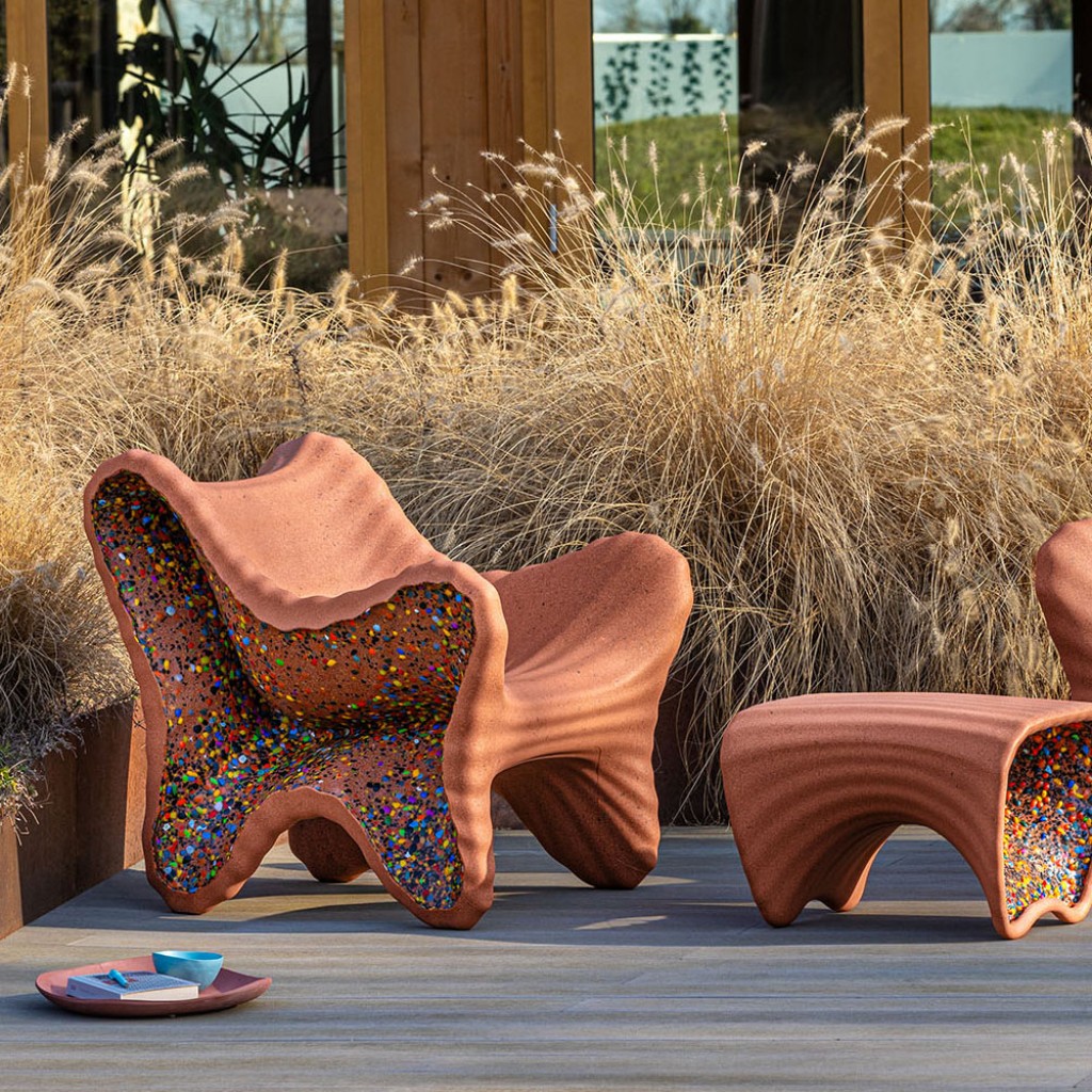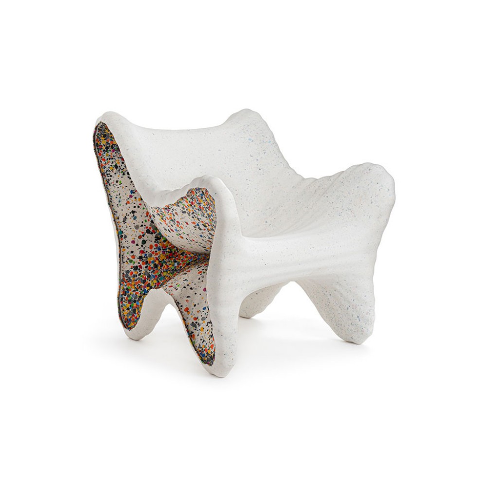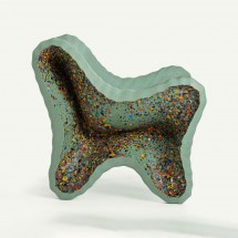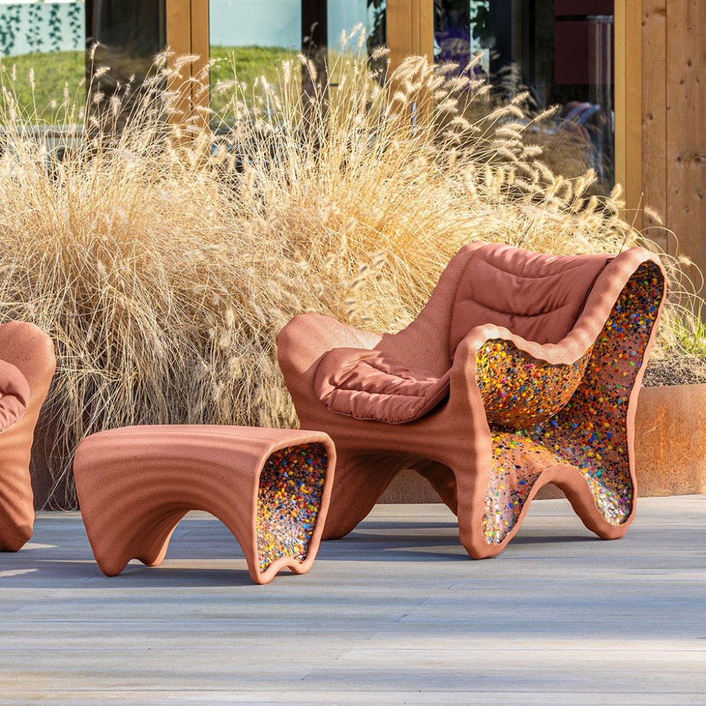 Materiale: polietilena ce contine material reciclat post-consum. Fulgi laterali multicolori din polietilena reciclata obtinuta din deseuri industriale. Potrivit pentru utilizare in exterior. Perna disponibila. Fiecare piesa este unica datorita amestecului de culori laterale.