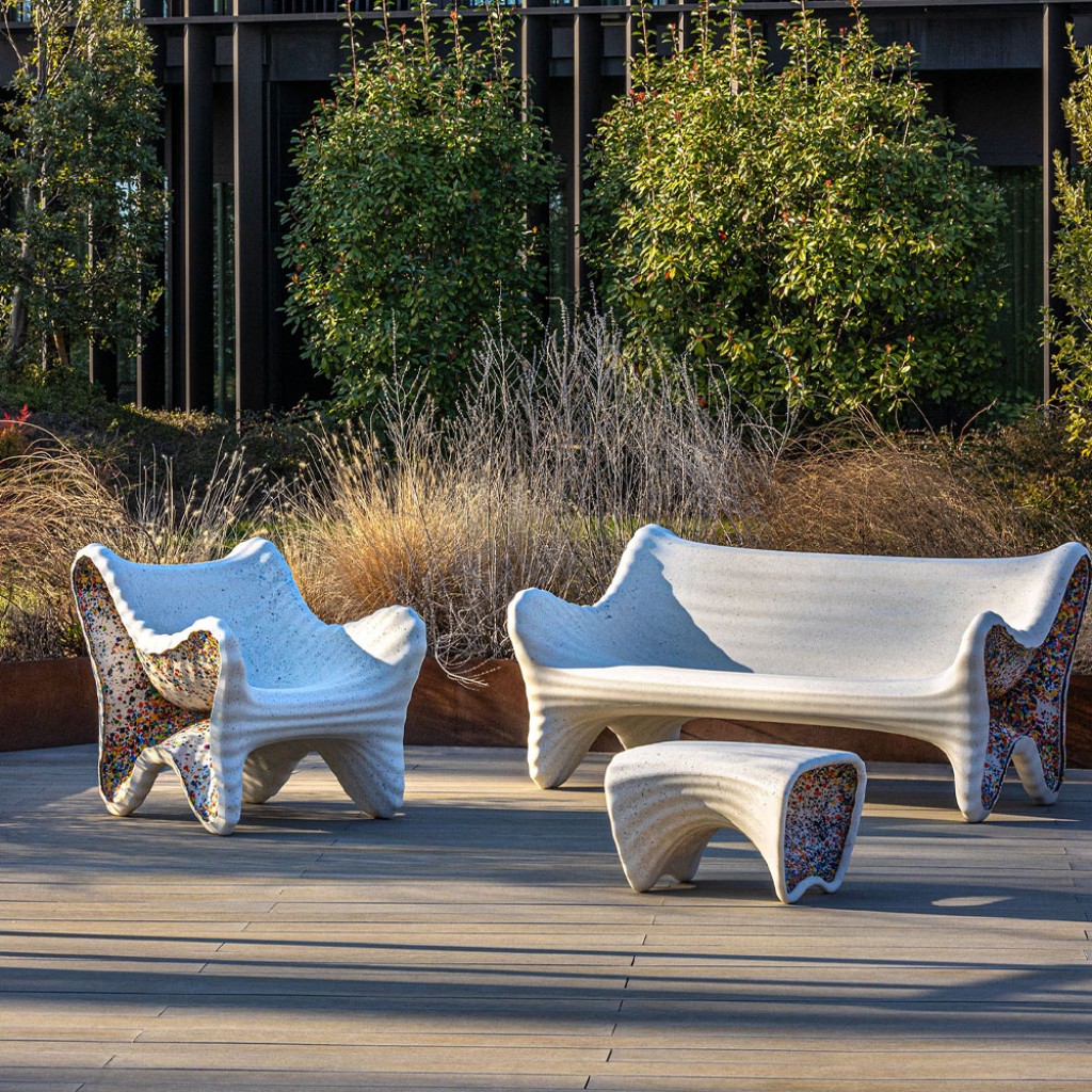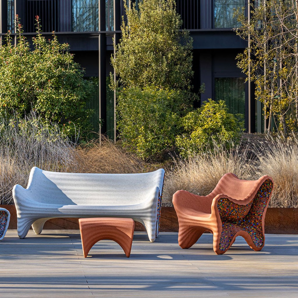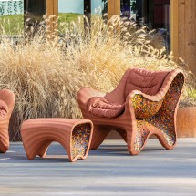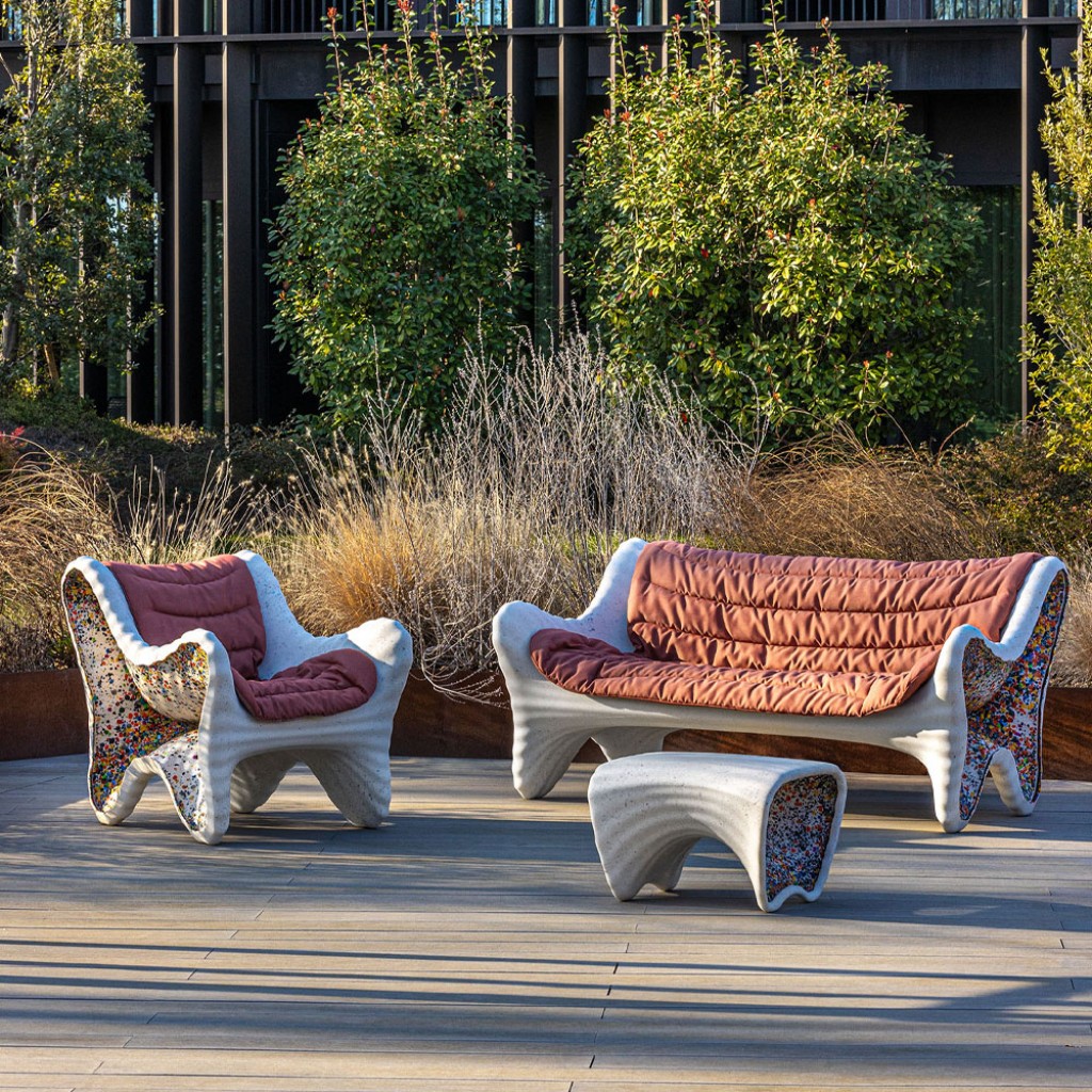 Materiale: polietilena ce contine material reciclat post-consum. Fulgi laterali multicolori din polietilena reciclata obtinuta din deseuri industriale. Potrivit pentru utilizare in exterior. Perna disponibila. Fiecare piesa este unica datorita amestecului de culori laterale.