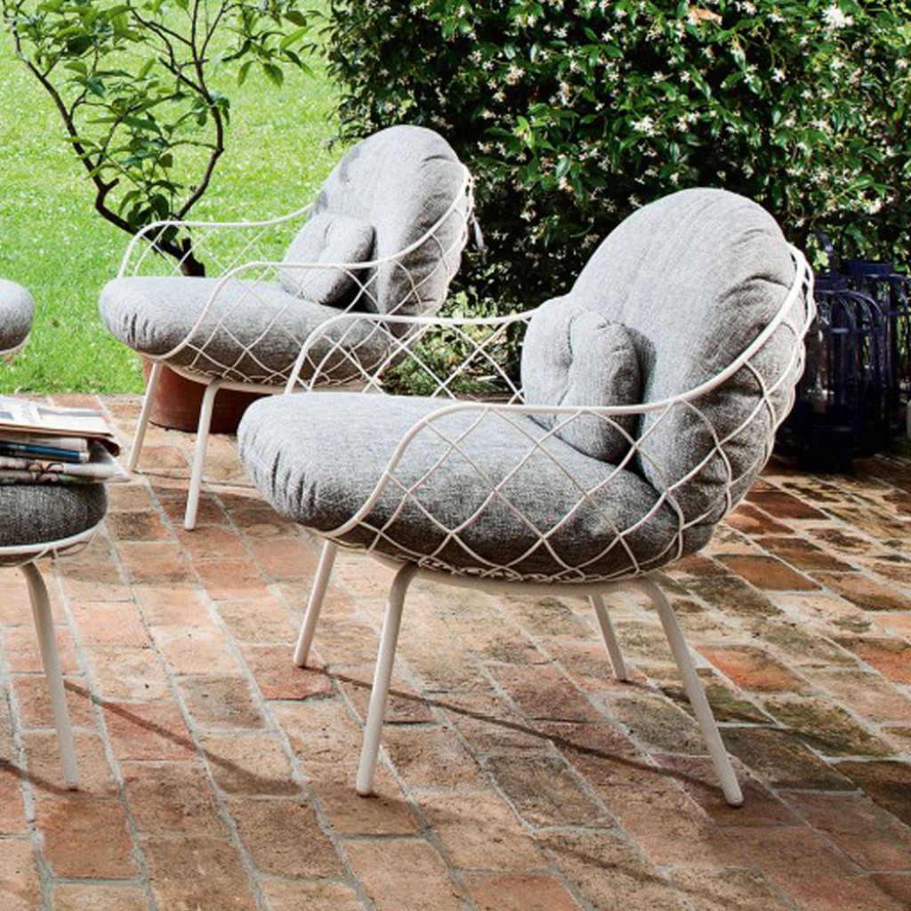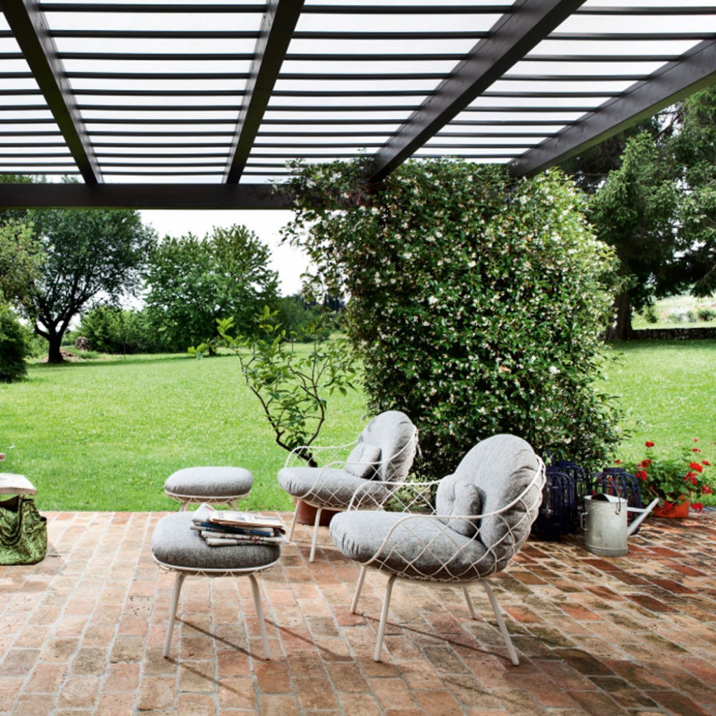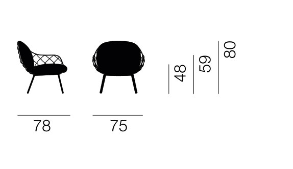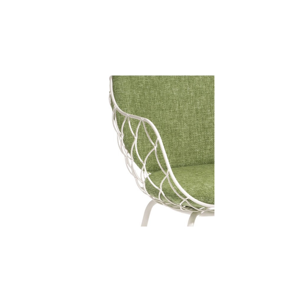 Cadru din tub de otel tratat cataforetic si vopsit cu pulbere de poliester. Scaun din tija de otel tratata cataforetic si vopsit cu pulbere de poliester. Perne sezut si spatar din poliuretan expandat cu husa detasabila din material textil (Polyhedra). Optional: perna de sprijin cu husa detasabila. Potrivit pentru utilizare in aer liber.