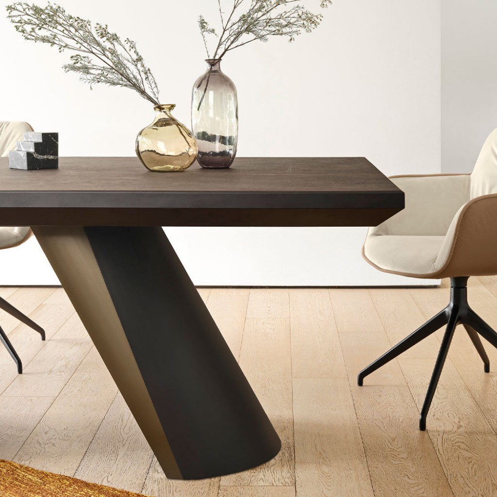 Cu o estetica eleganta, masa Apian adopta o abordare de design arhitectural si a fost realizata cu meticulozitate din materiale rafinate. Look-ul aerisit aminteste de o tabla de metal curbata si inclinata, creand o baza cu o forma indrazneata si ascutita care culmineaza cu un blat echipat cu un mecanism patentat care ii permite sa fie extinsa pana la 3 metri in lungime. Marginea blatului face ecoul nuantei bazei care a fost detaliata cu tabla dubla acoperita, care straluceste si capteaza lumina.Apian este una dintre acele piese neasteptate care vor intoarce instantaneu un proiect de design interior.