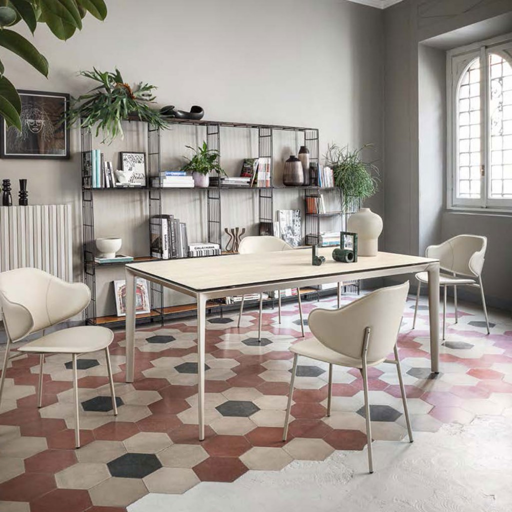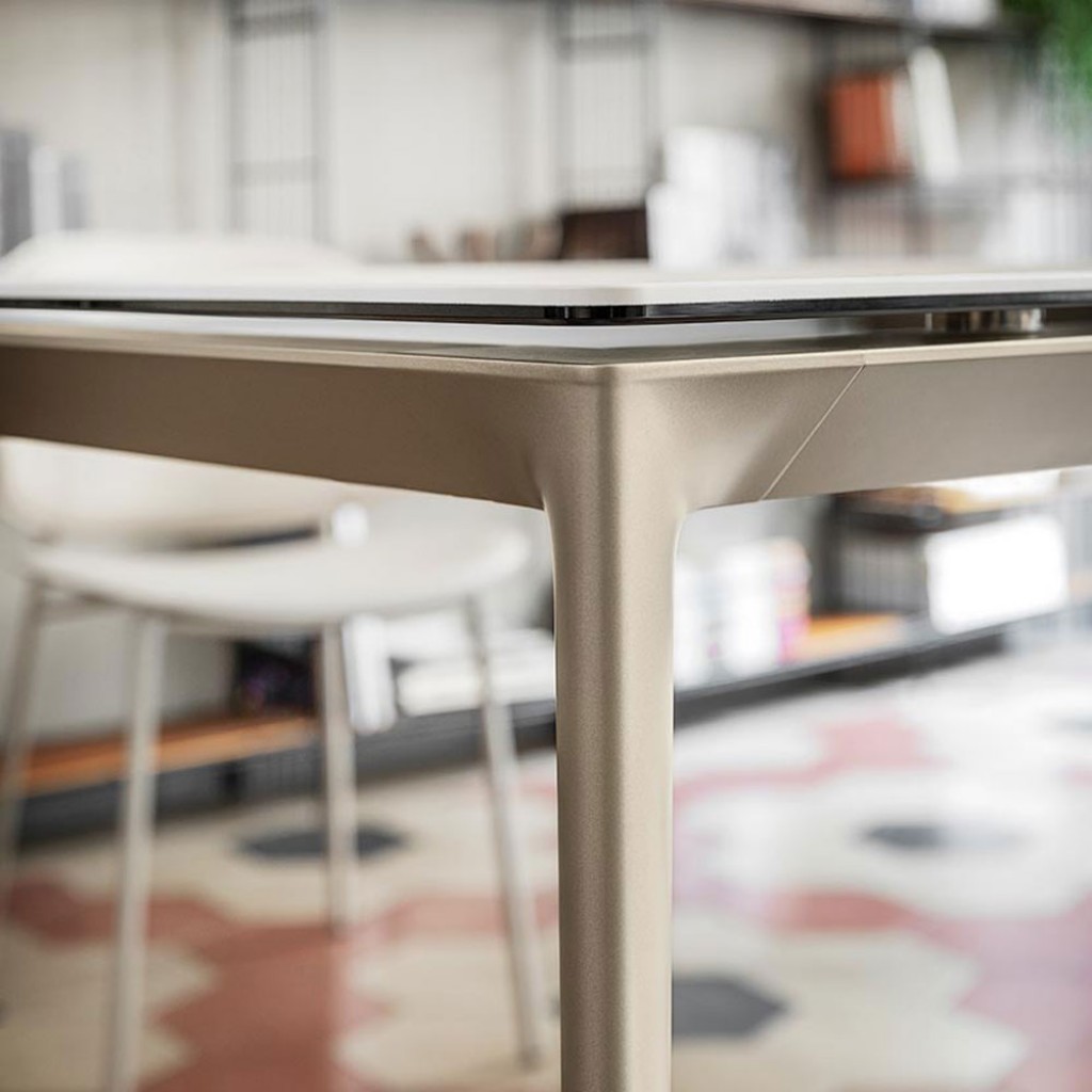 Masa extensibila cu blat ceramic, caracterizata prin continuitatea perfecta a venaturii intre blat si extensii, creand un efect estetic rafinat si uniform. Sistemul de deschidere si inchider.. -