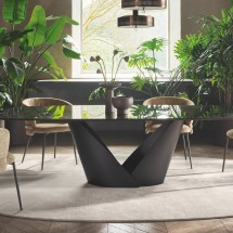 Masa Kiri combina elemente verticale aerisite, intr-o succesiune de tije metalice, cu un varf compact. Masa poate fi ovala sau dreptunghiulara, cu blat din lemn, sticla sau gresie.Dimensi.. -