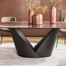 Masa Cartesio se mandreste cu linii iconice, elegante si cu un blat rotund din ceramica asezat pe un cadru original de sustinere a greutatii din metal compus din patru elemente dreptunghiula.. -
