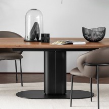 Cameo este o masa extensibila cu o silueta ovala bine definita, care ii confera o personalitate puternica si nu numai ca ofera stabilitate, dar permite si utilizarea la maximum a spatiului de sub blat. Fabricata din metal acoperit, coloana centrala sustine diferitele tipuri de blaturi; combinatia metal/lemn este invariabil rafinata, in timp ce amestecul de metal si ceramica cu efect de marmura creeaza un contrast jucaus intre materialele reci si cele calde si este extrem de modern.