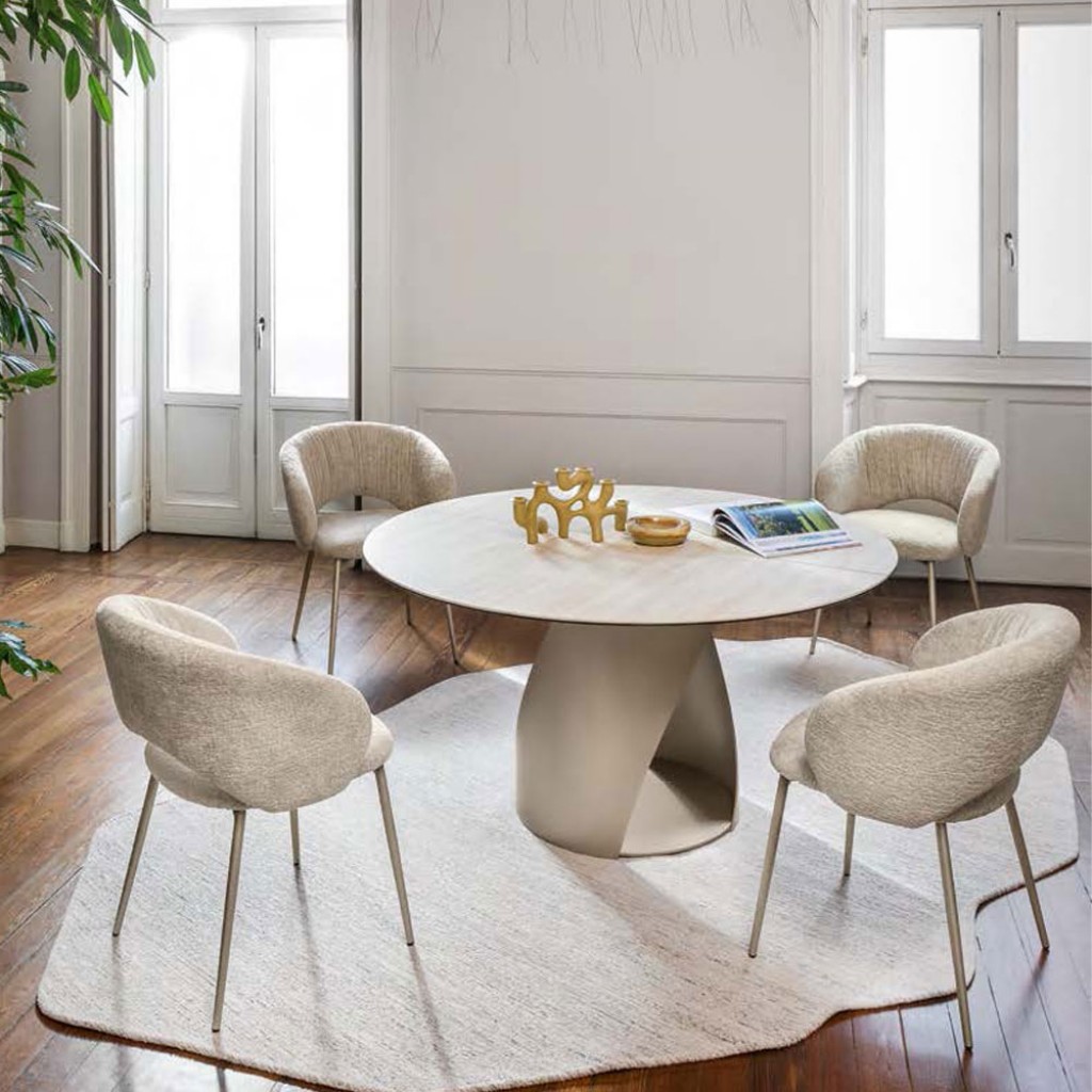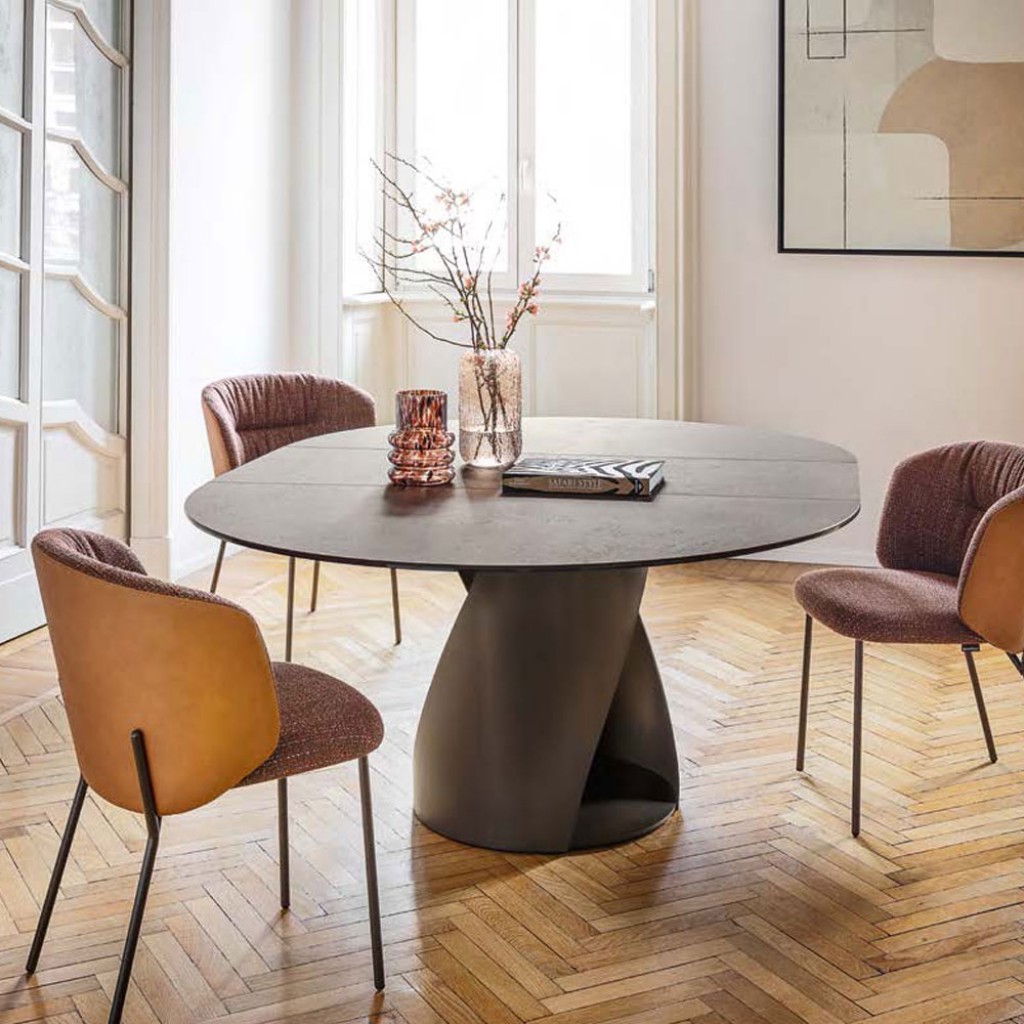 Masa extensibila cu blat ceramic, cu continuitate a venaturii intre blat si extensii, pentru un efect estetic rafinat si unitar. Sistemul de deschidere si inchidere este prevazut cu mecanism.. -
