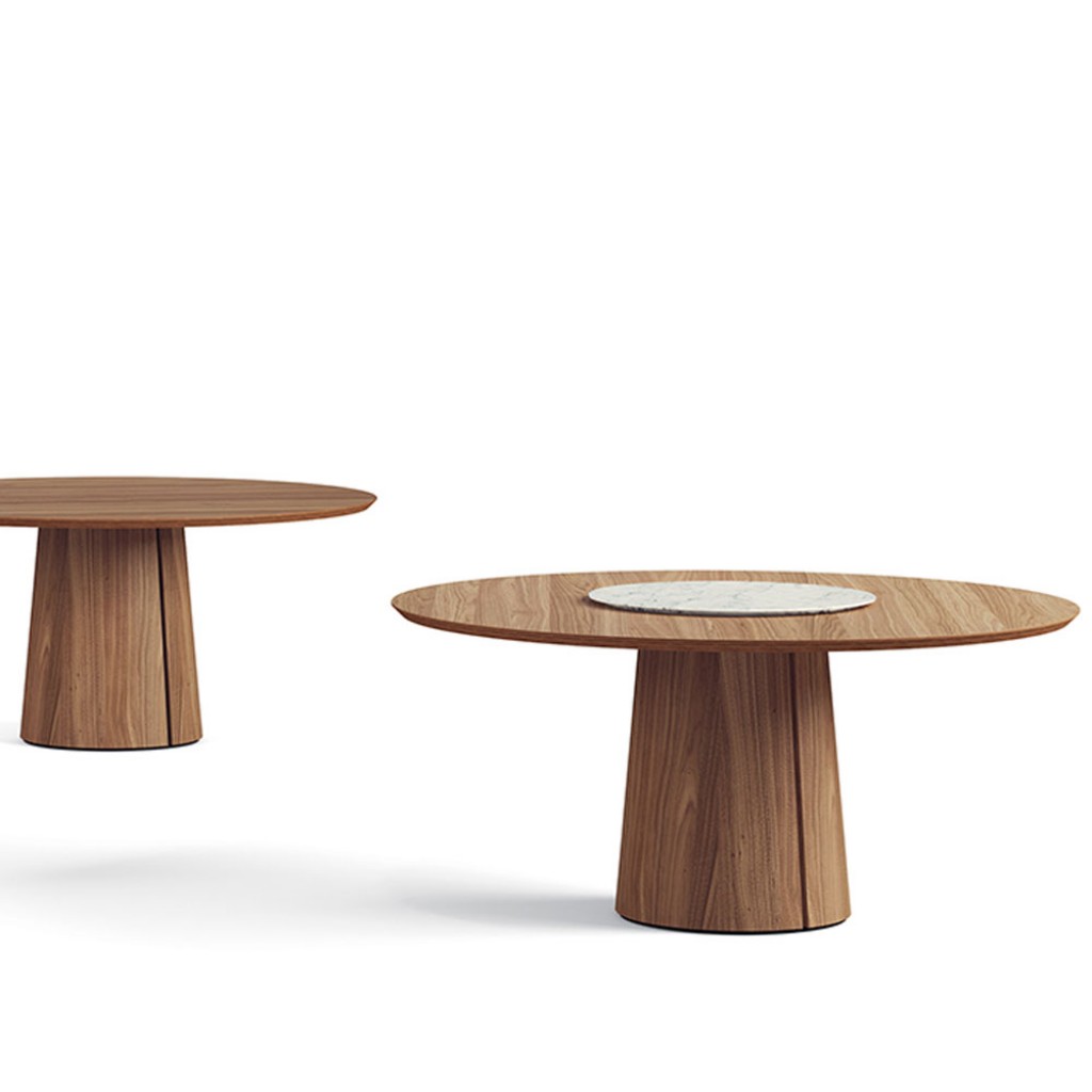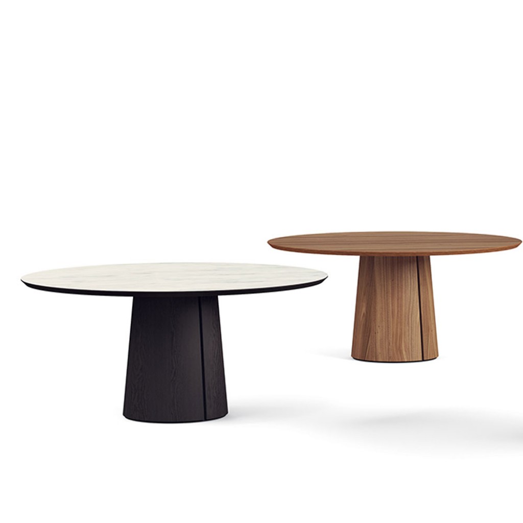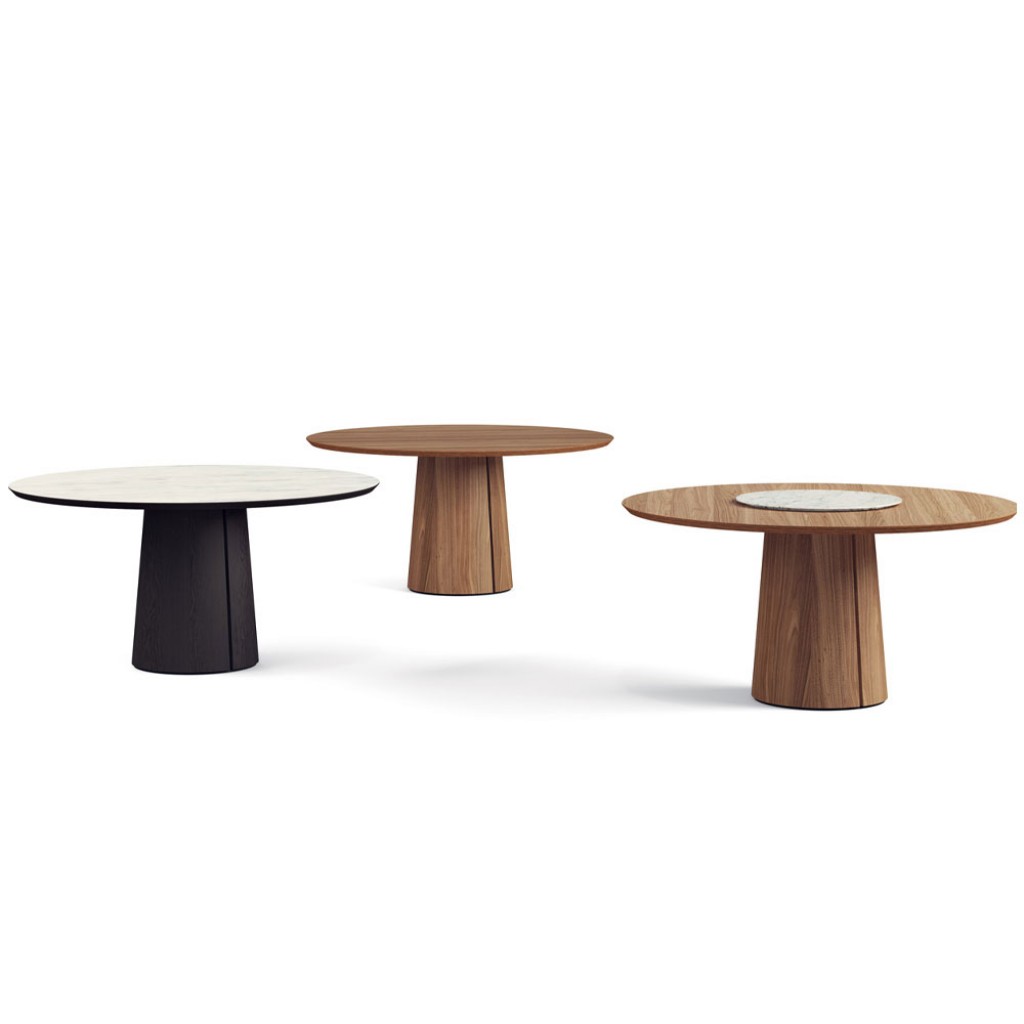 Masa rotunda Arona, cu o baza centrala conica placata in nuc Canaletto si disponibila in diverse finisaje, combina dimensiuni generoase cu stabilitate si o nota distinctiva. Blatul de 160 cm, cu margini rotunjite, este disponibil in frasin, nuc Canaletto si gresie portelanata. Include un Lazy Susan central, disponibil intr-un finisaj separat pentru a crea contraste de culoare. Versatila in orice ambient, de la dining la zona de intrare, masa Arona favorizeaza convivialitatea, fiind ideala pentru grupuri si familii. Conceputa ca un punct focal al conversatiei, aspira sa devina centrul atentiei.