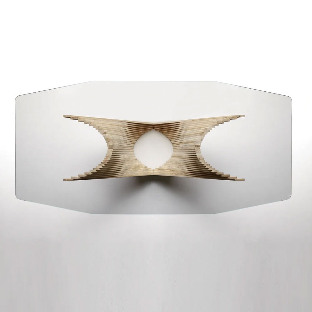 Aceasta este o propunere care va avea cu siguranta un impact: Bow se invarte in jurul contrastului dintre lemnul de frasin, folosit manual pentru a crea fasiile celor doua picioare ale mesei.. -