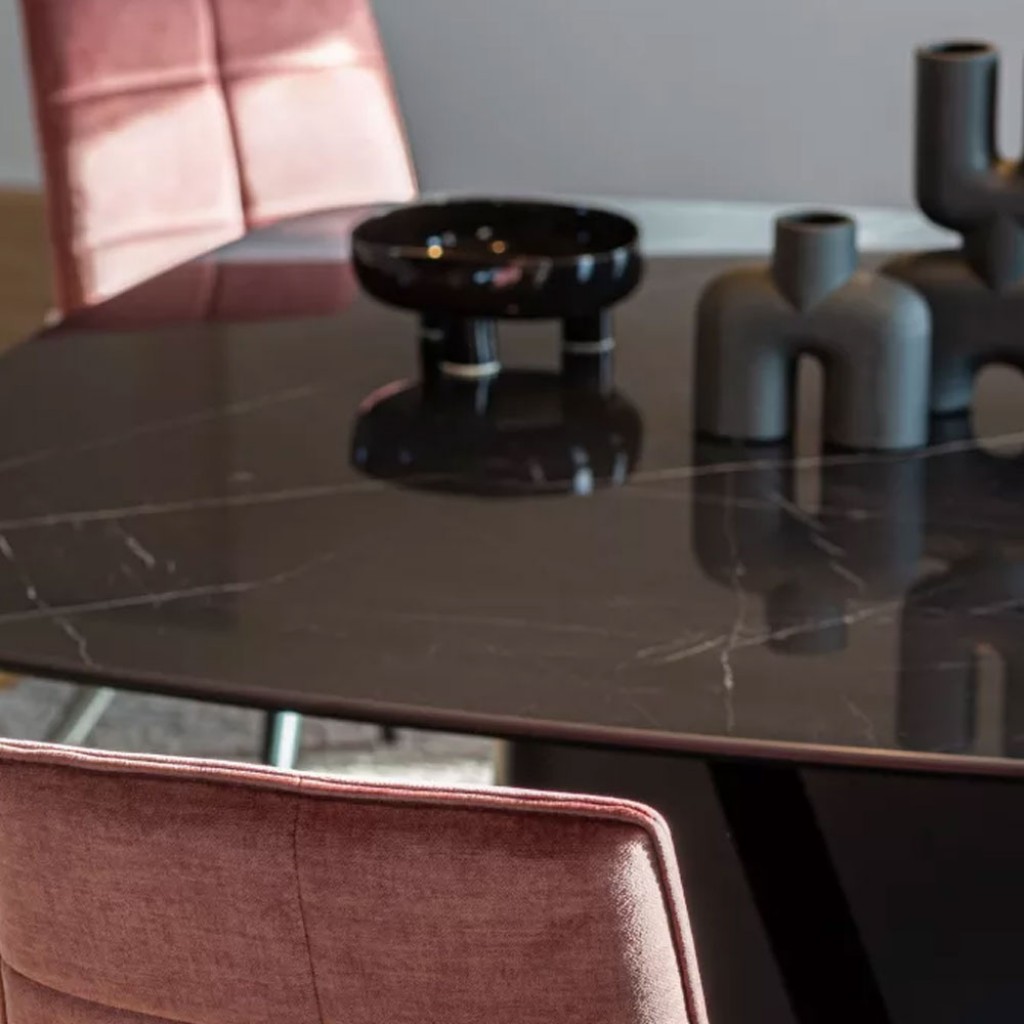 Masa cu blat oval din ceramica maxfine sau lemn furnir lacuit si baza din lemn.Dimensiuni:Lungime – 220 / 180 / 200 / 240 / 260 cmLatime – 110 / 100 / 100 / 110 / 110 cmInaltime – 75 cm.. -