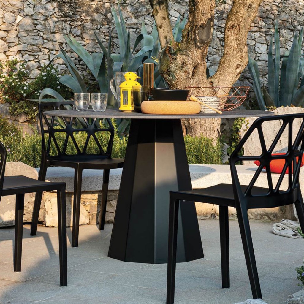 Dix este intruchiparea ospitalitatii, cu o baza din tabla fatetata ce reflecta armonios lumina in aer liber. Are picioare interne reglabile, este usor de curatat si poate avea blat din MDF sau ceramica imbunatatita cu tehnologia in-side.