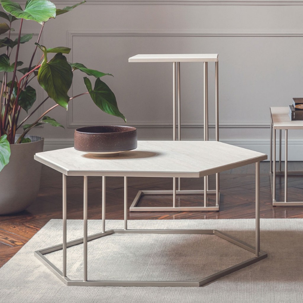 Renee este o colectie de masute de cafea disponibile intr-o varietate de forme geometrice, dimensiuni si inaltimi. Blaturile hexagonale si patrate vin fie din sticla oglinda cu efect de unda atractiv, fie din ceramica. Designul atinge un echilibru perfect intre minimalism si rafinament, ceea ce inseamna ca aceste articole se vor adapta cu usurinta oricaror cerinte.