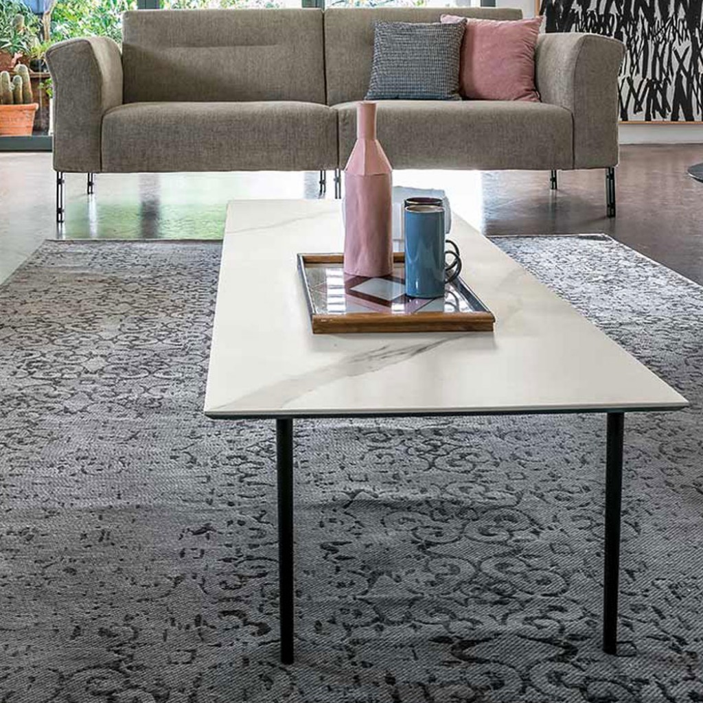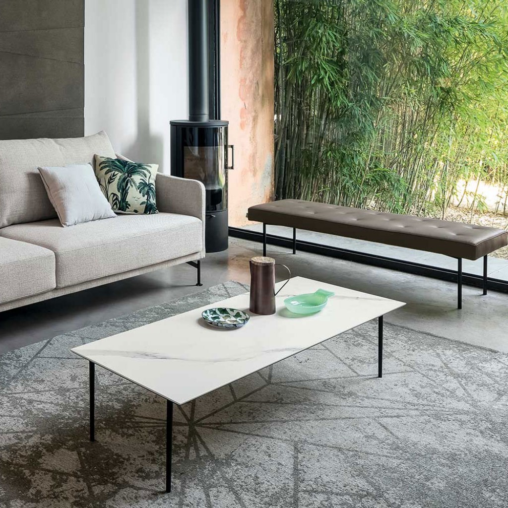 Erys reprezinta o colectie de mobila complementara, formata din diferite forme si marimi, cu rame metalice si blaturi din lemn sau din marmura. Mesele de cafea mari si joase stau in fata can.. -