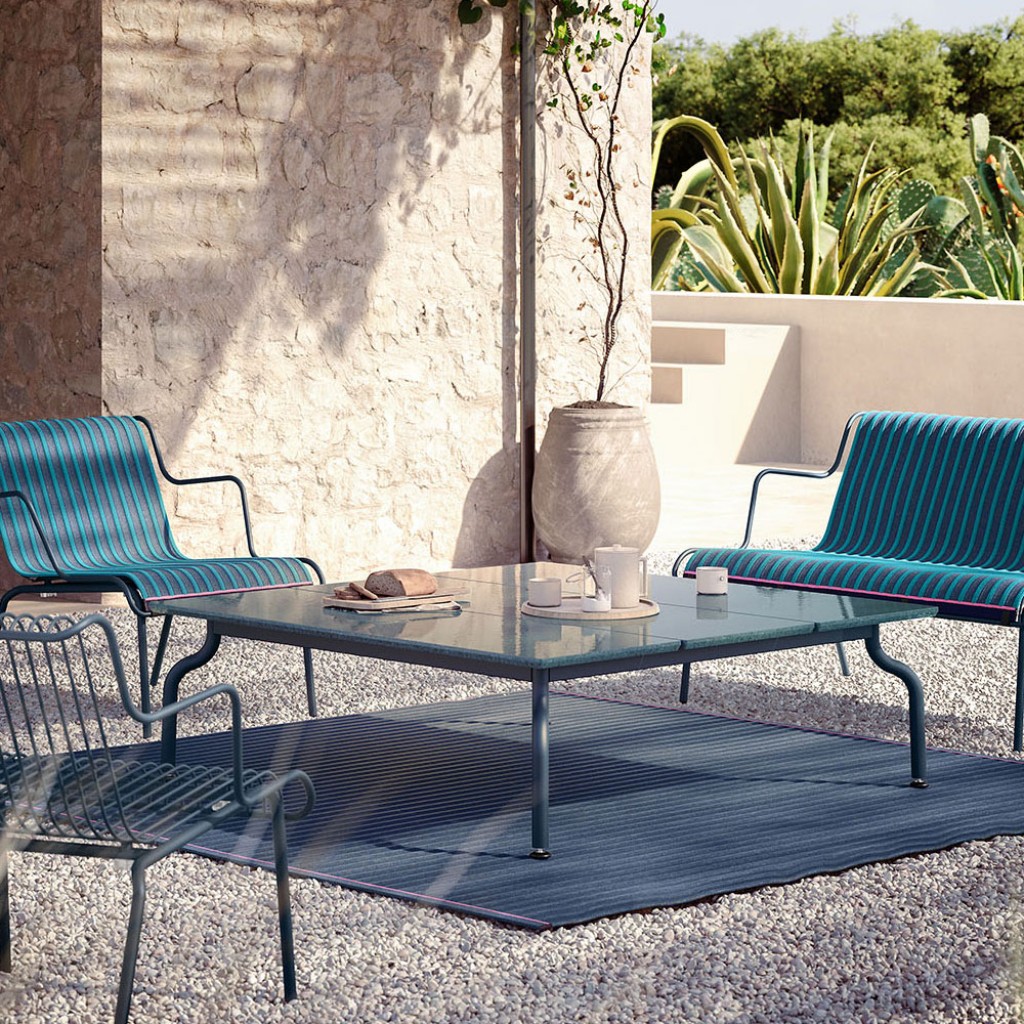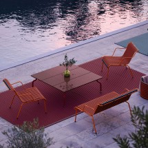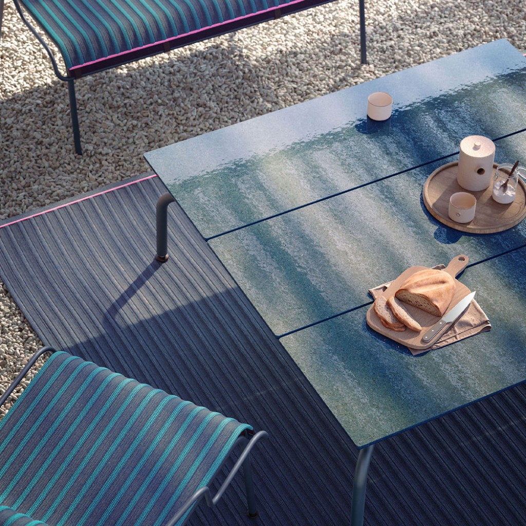 Materiale: cadru din tub de otel, tratat cataforetic si vopsit cu pulbere de poliester. Blat din lemn de tec sau piatra vulcanica. Picioare reglabile si pivotante. Potrivit pentru utilizare in exterior.