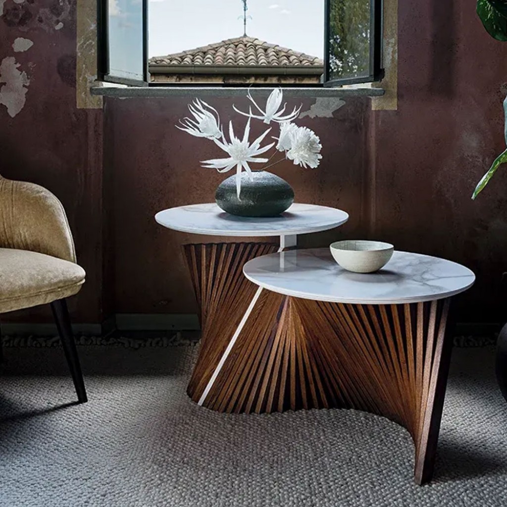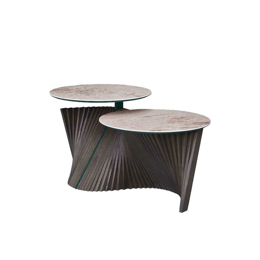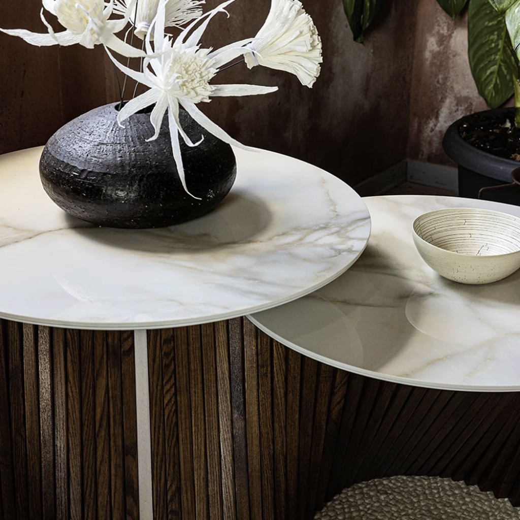 Masa Eclipse: o piesa unica de design, cu doua blaturi usor decalate, ce evoca imaginea unei eclipse. Acest accesoriu de mobilier pastreaza sistemul de fasii din lemn masiv realizate manual si include insertii interesante, asortate cu finisajul blatului ales din gresie cu efect de marmura. Este perfect atat pentru spatiile de locuit, cat si pentru mediile comerciale si de ospitalitate.