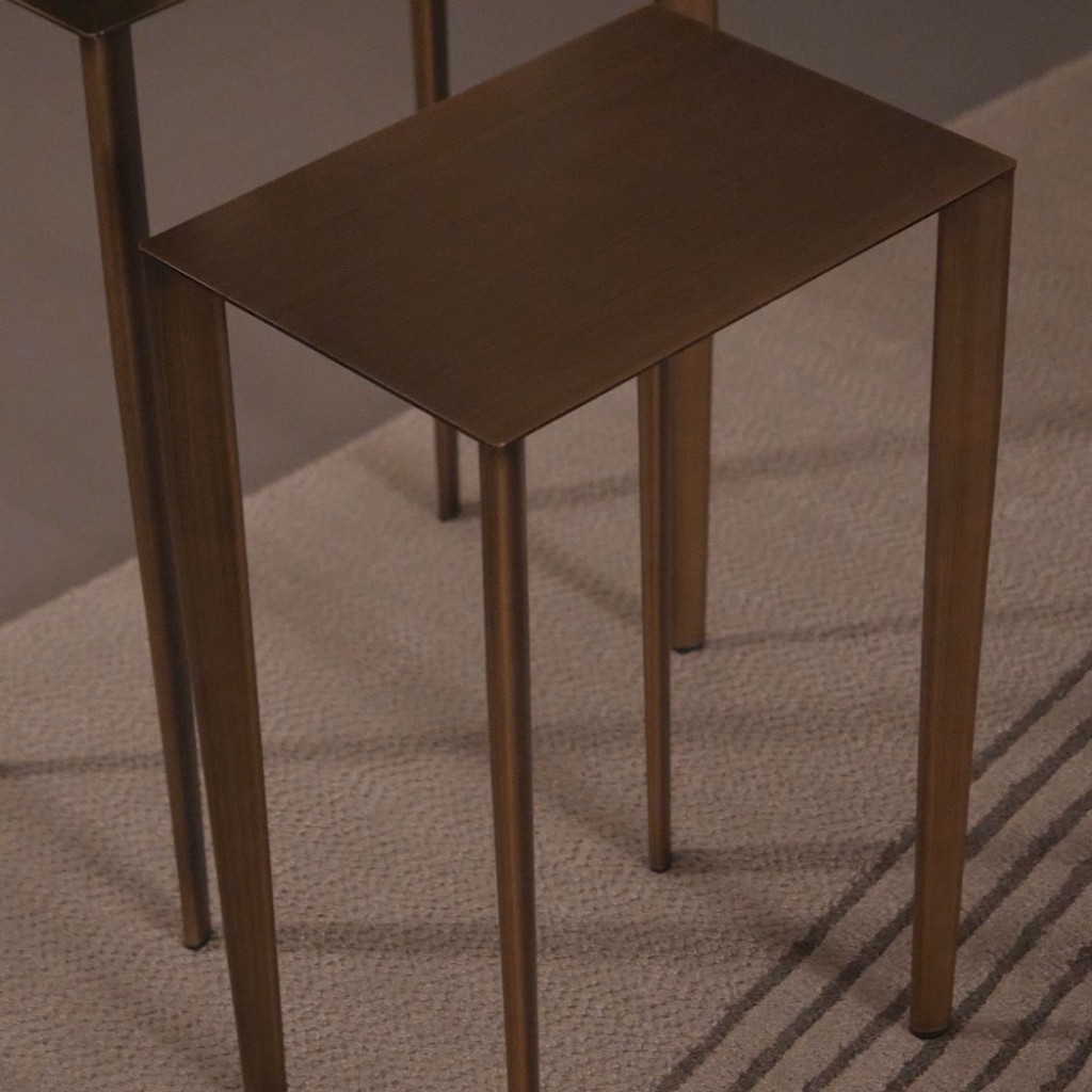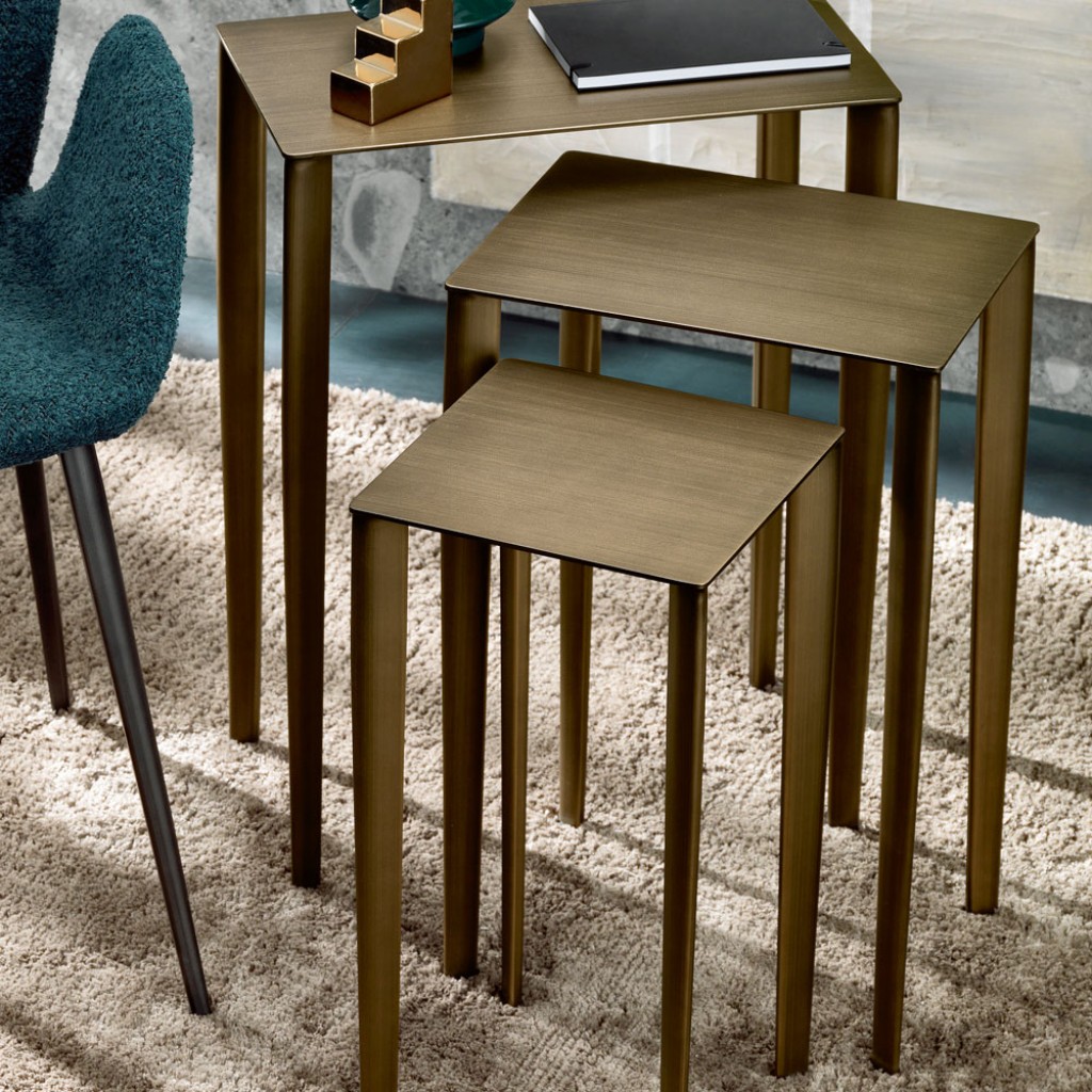 Conceput pentru a raspandi lejeritate cu gratia proportiilor, setul de masute de cafea Tris se caracterizeaza printr-o linie hotarata subtire. Lungimea picioarelor, aproape exagerata este asociata cu o linie esentiala fara volan. Figura estetica este totul in material, metalul, care capata o capacitate expresiva exceptionala datorita tratamentului extraordinar de periere manuala pe majoritatea finisajelor. Rezultatul este o completare capabila sa ofere mediului inconjurator o nota de eleganta, simplitate si esentialitate. Disponibila in culoarea grafit sau alama periata manual, titan, cobalt sau tibetan.