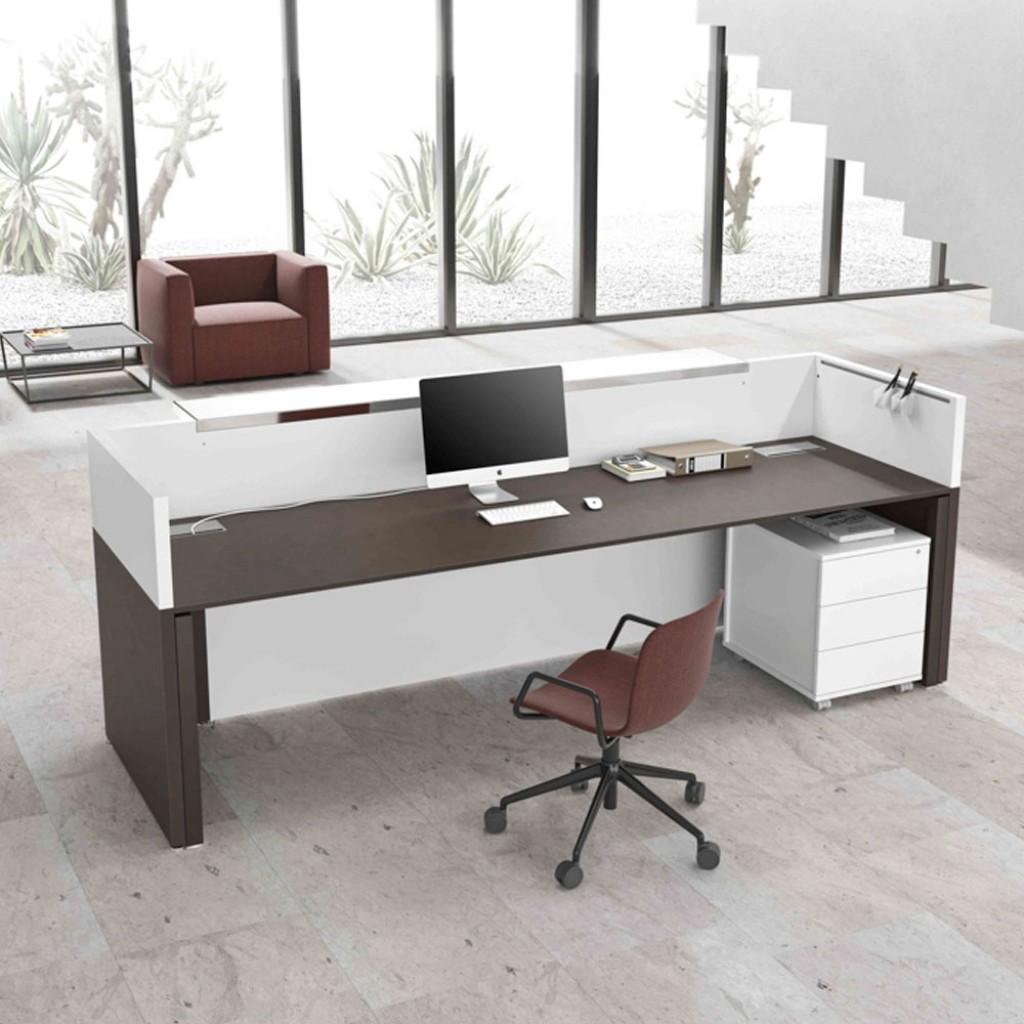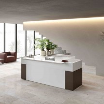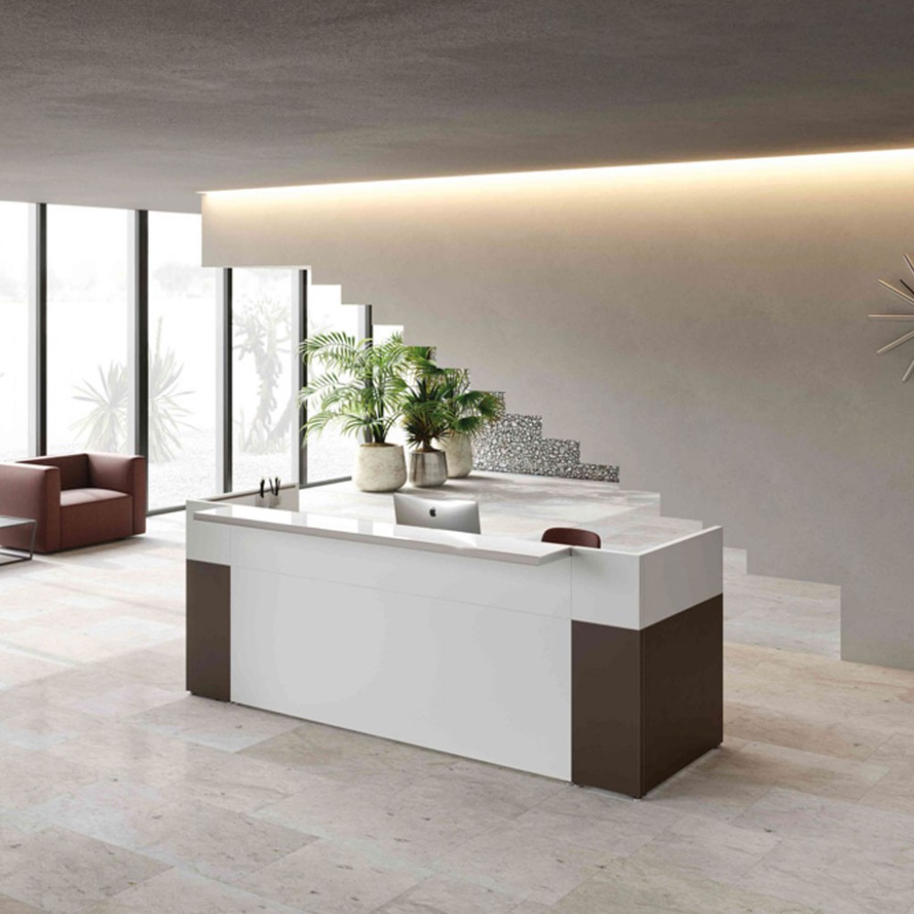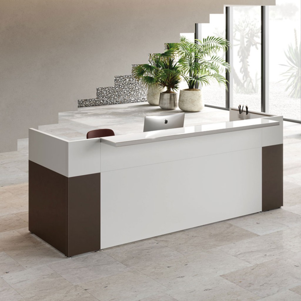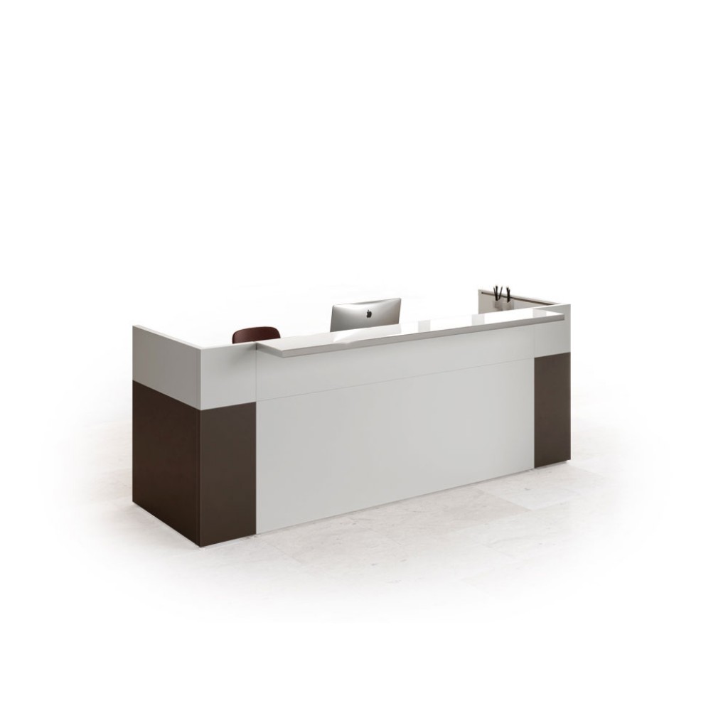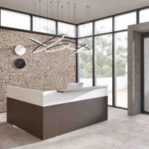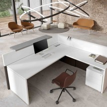 Liniile geometrice si minimale ofera receptiei Filon un aspect tanar si prospetime versatila. Receptie cu design contemporan, laterale si panouri de melamina structurale frontale in diferite culori. Blatul este din sticla pictata cu latura de aluminiu lustruit sau in melamina si poate fi plasat in trei moduri diferite: centrat, proeminent sau adancit.