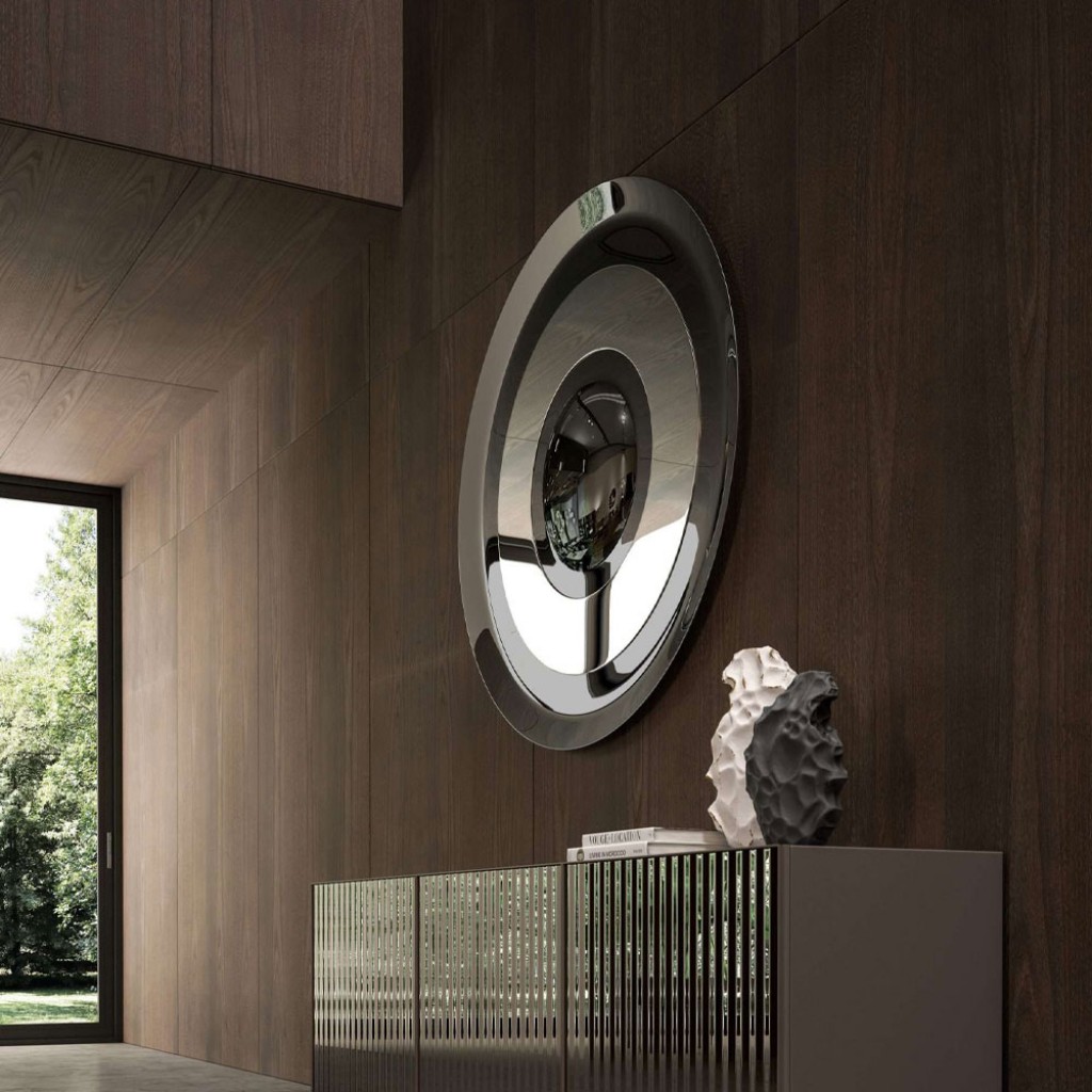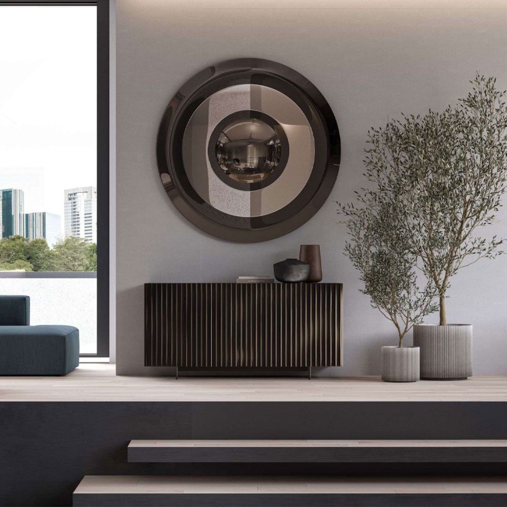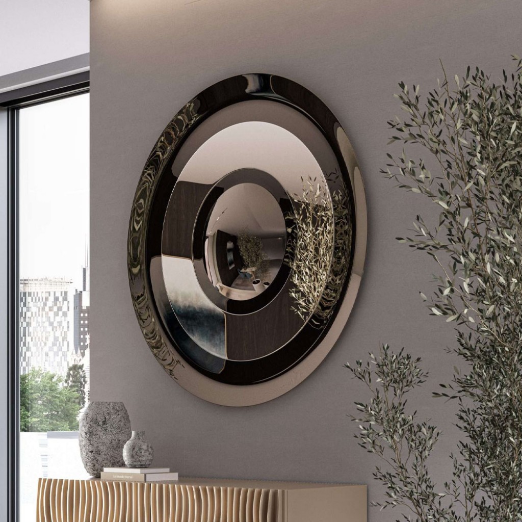 Oglinda Dorian este o piesa distinctiva si eleganta, caracterizata printr-un joc sofisticat de cercuri concentrice din sticla plana si curbata, care creeaza un efect vizual fascinant de profunzime si miscare. Silueta sa rafinata atrage imediat privirea, transformand orice incapere intr-un spatiu cu adevarat elegant. Disponibila in finisaje rafinate bronz si fumé, oglinda Dorian nu este doar un accesoriu decorativ, ci o adevarata declaratie de stil, capabila sa imbogateasca fiecare colt al locuintei cu o nota de lux discret si modern.