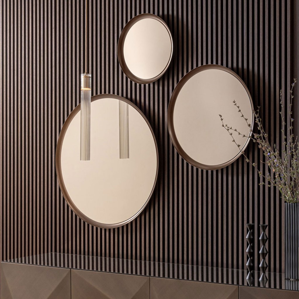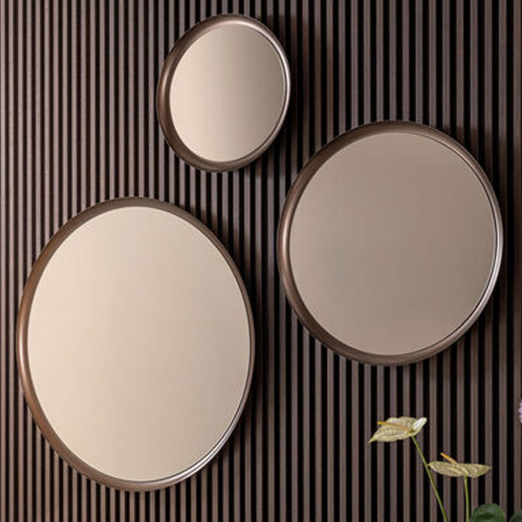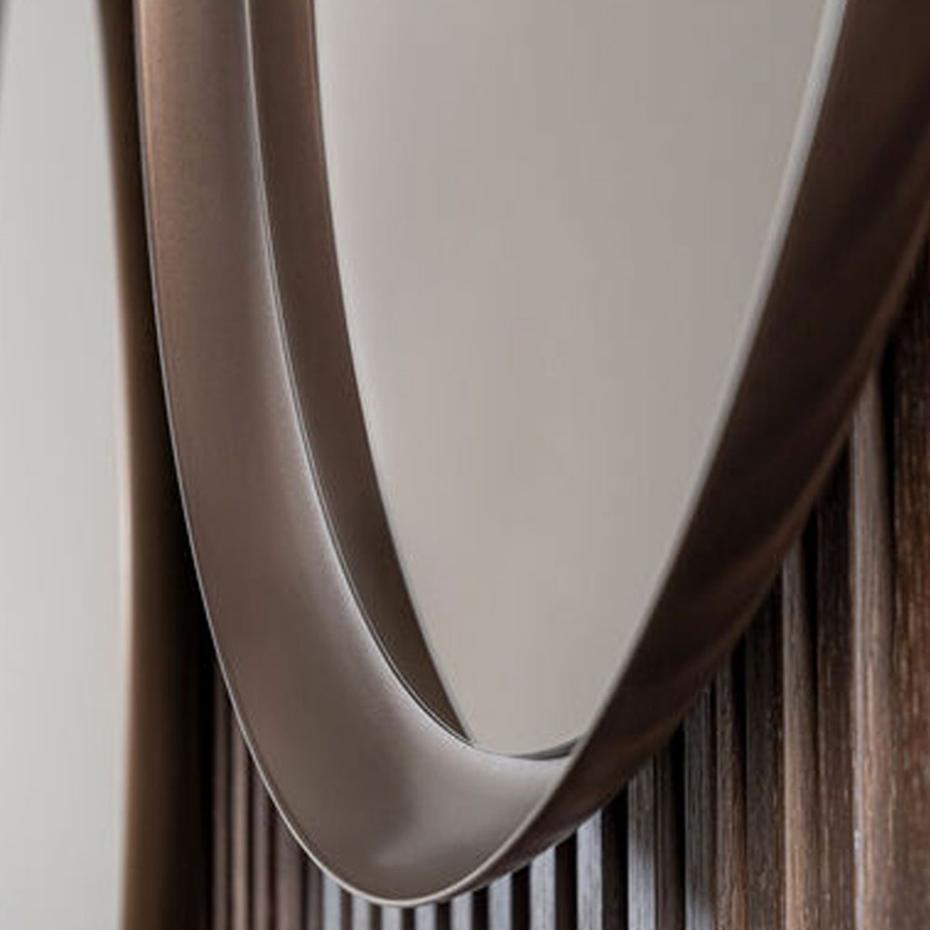 Oglinzile Ring intruchipeaza eleganta pura si farmecul atemporal. Disponibila in patru dimensiuni, se adapteaza cu gratie oricarui spatiu, reflectand nu doar imaginea, ci chiar sufletul mediului ambiant. Cadrul lor metalic vopsit cu bronz imbratiseaza cristalul bronzat in oglinda, creand un joc de lumini si reflexii care invaluie privirea intr-o atmosfera calda si sofisticata. Fiecare oglinda Ring devine astfel un obiect de arta, in care contrastul dintre robustetea metalului si delicatetea suprafetei de oglinda transforma fiecare reflectie intr-o experienta emotionala.
