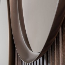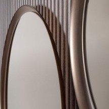 O oglinda cu geometrie ovala, montata pe perete cu o usoara inclinare. Rama din lemn masiv se evidentiaza printr-un joc subtil de volume, afirmandu-si prezenta si extinzandu-se delicat catre.. -