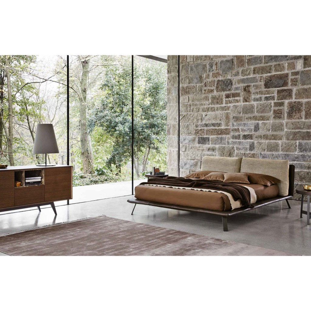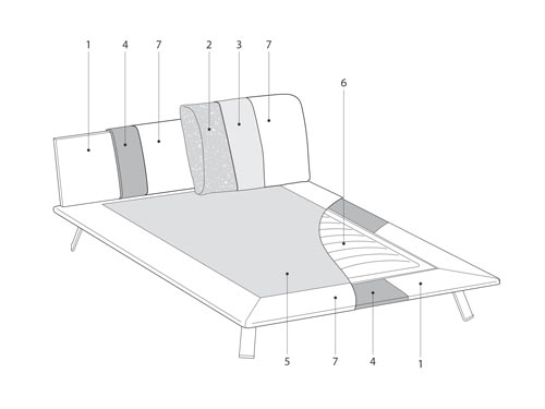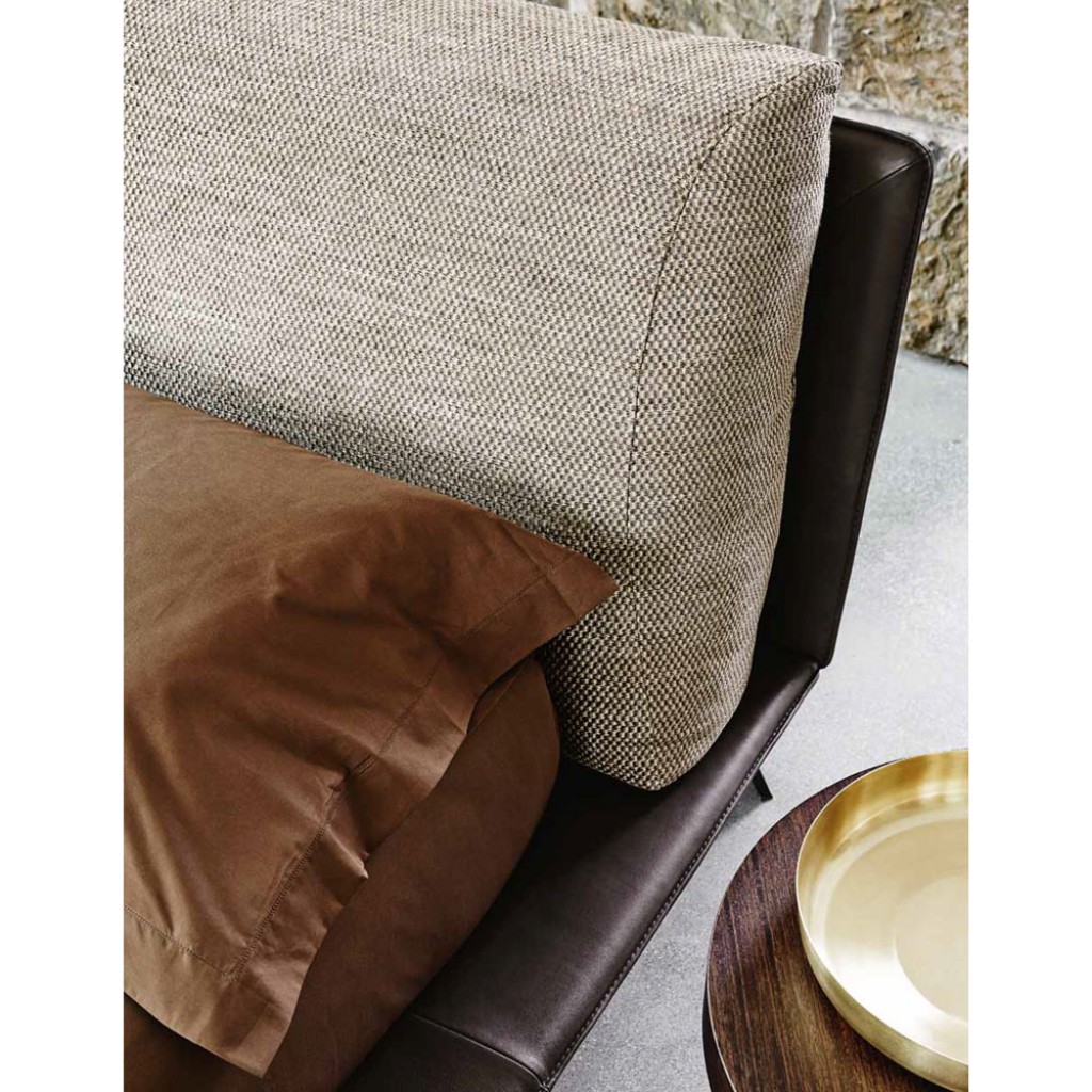 O combinatie de mobilier pentru zona de dormit. Un pat a carui tablie generoasa aminteste de ideea de perna moale. Design – Stefano SpessottoDimensiuni disponibile la cerere.. -