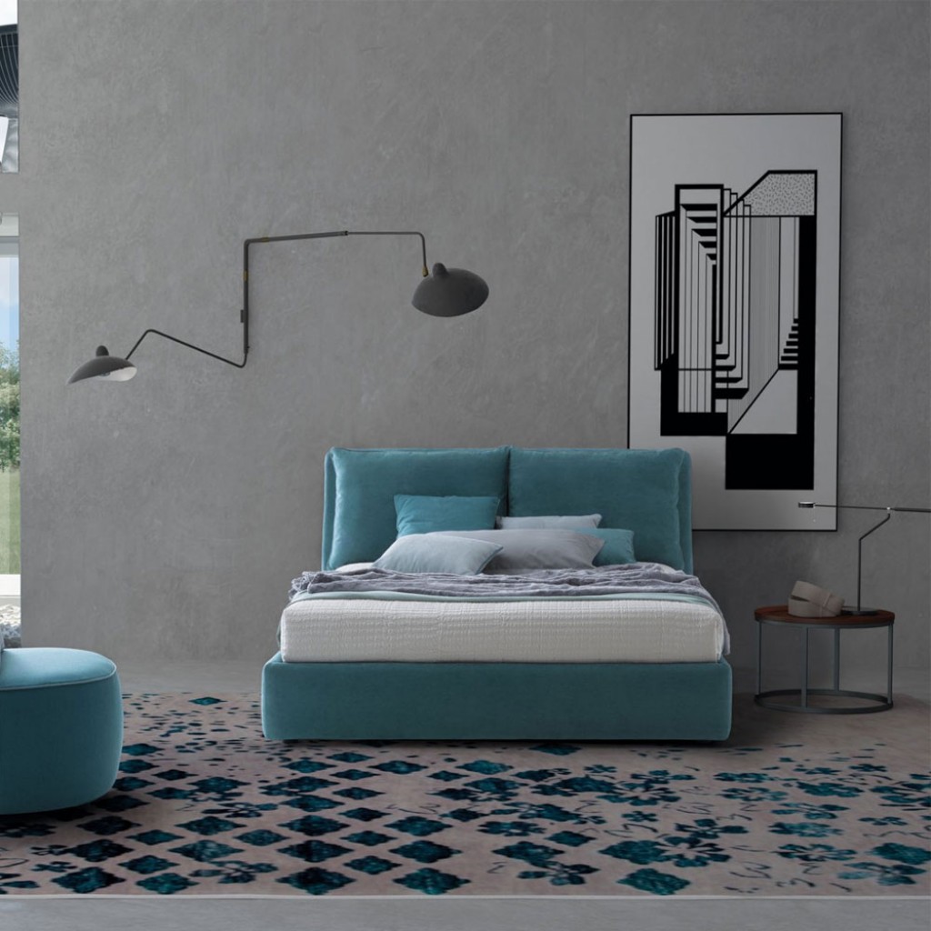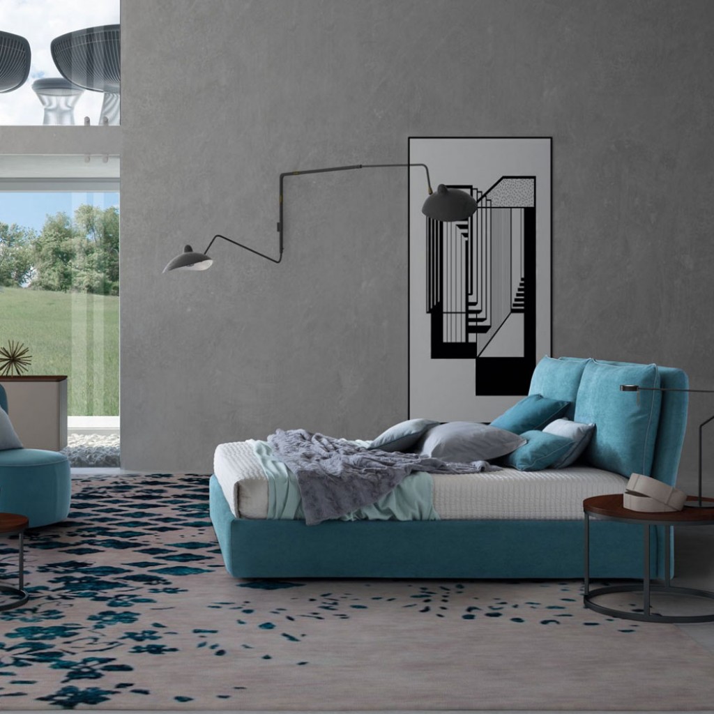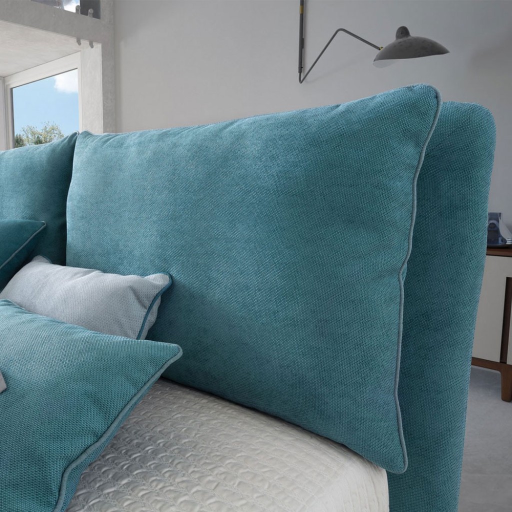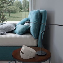 O combinatie de mobilier pentru zona de dormit. Un pat a carui tablie generoasa aminteste de ideea de perna moale. Design – Stefano SpessottoDimensiuni disponibile la cerere.. -