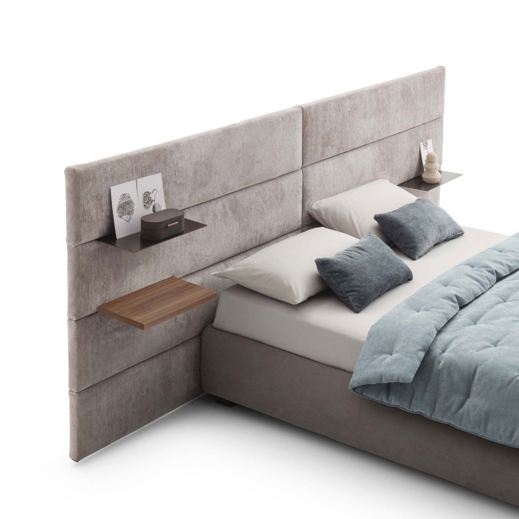 Pat cu tablie captusita orizontal si rafturi laterale.