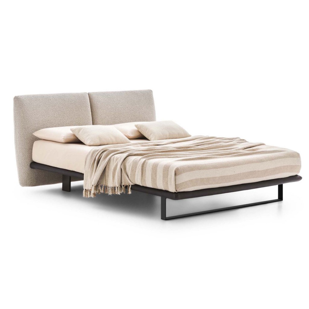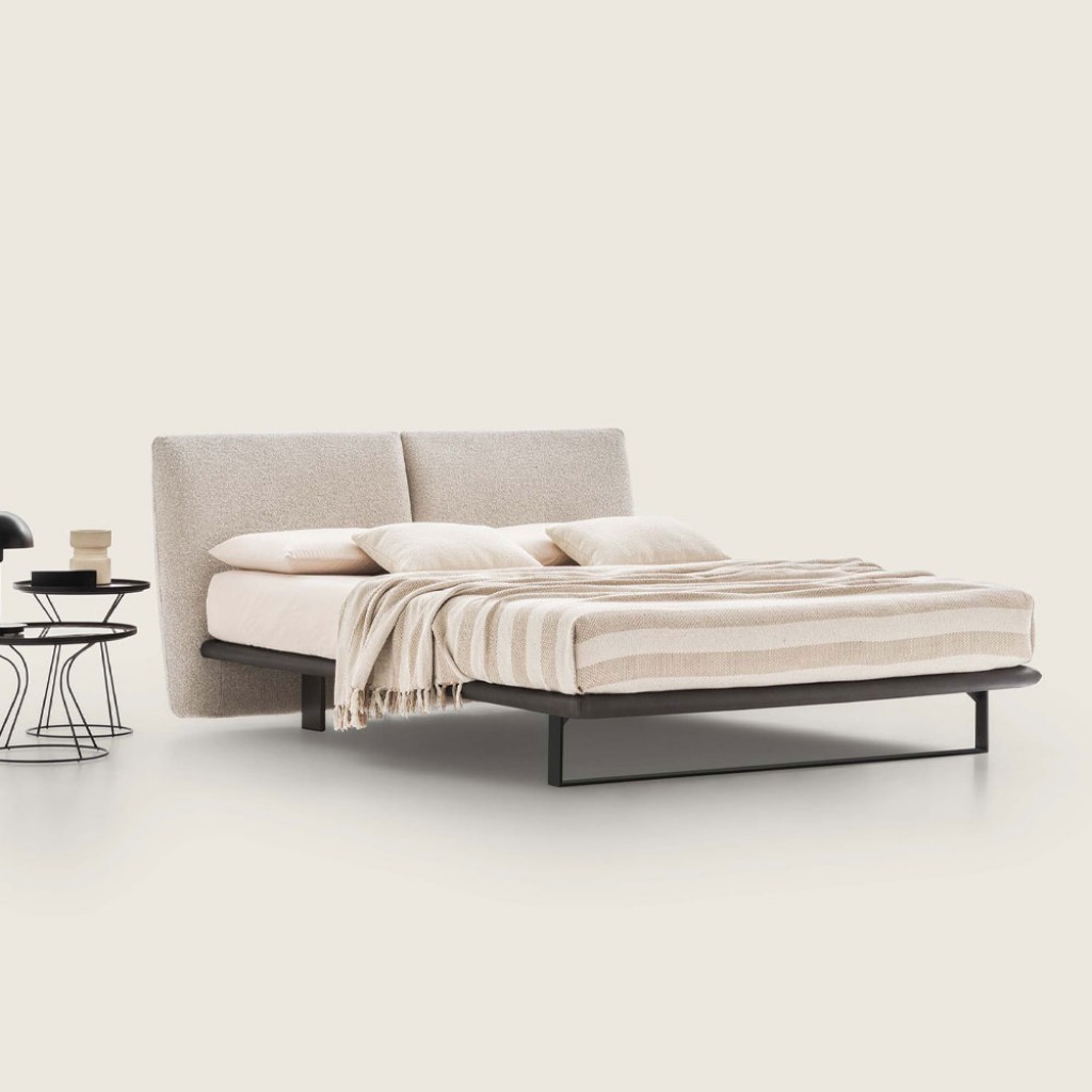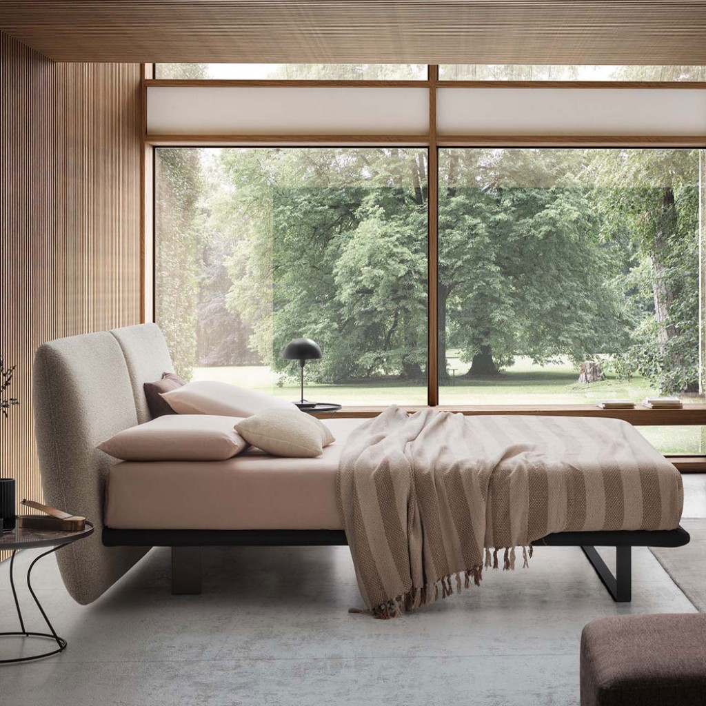 Patul Alar are un design minimal si arbonios, cu spatar subtire, tapitat in tesatura sau piele, pe care se pot sprijini optional doua perne de sustinere pentru un confort sporit.Design by St.. -