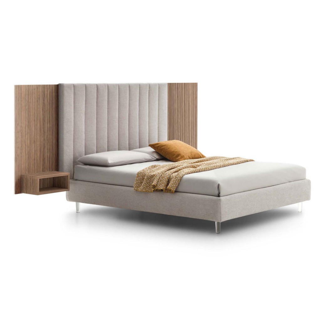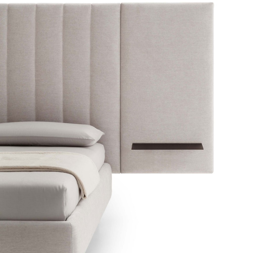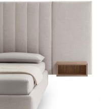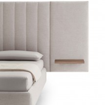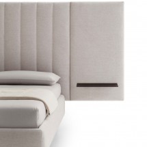 Pat contract cu tablie verticala captusita si panouri laterale cu rafturi incorporate.
