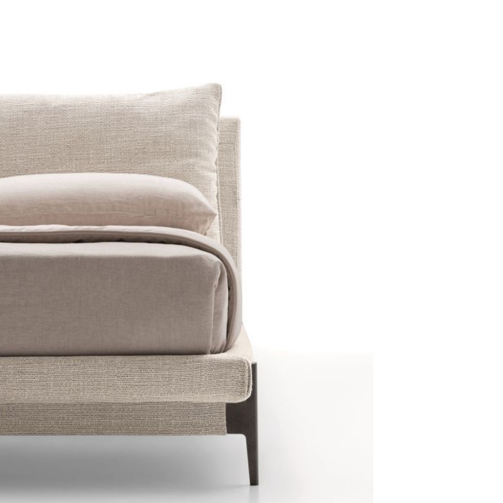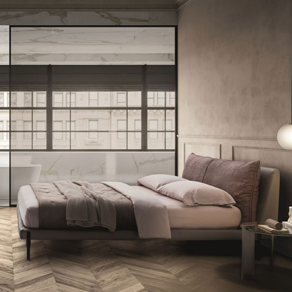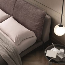 O combinatie de mobilier pentru zona de dormit. Un pat a carui tablie generoasa aminteste de ideea de perna moale. Design – Stefano SpessottoDimensiuni disponibile la cerere.. -