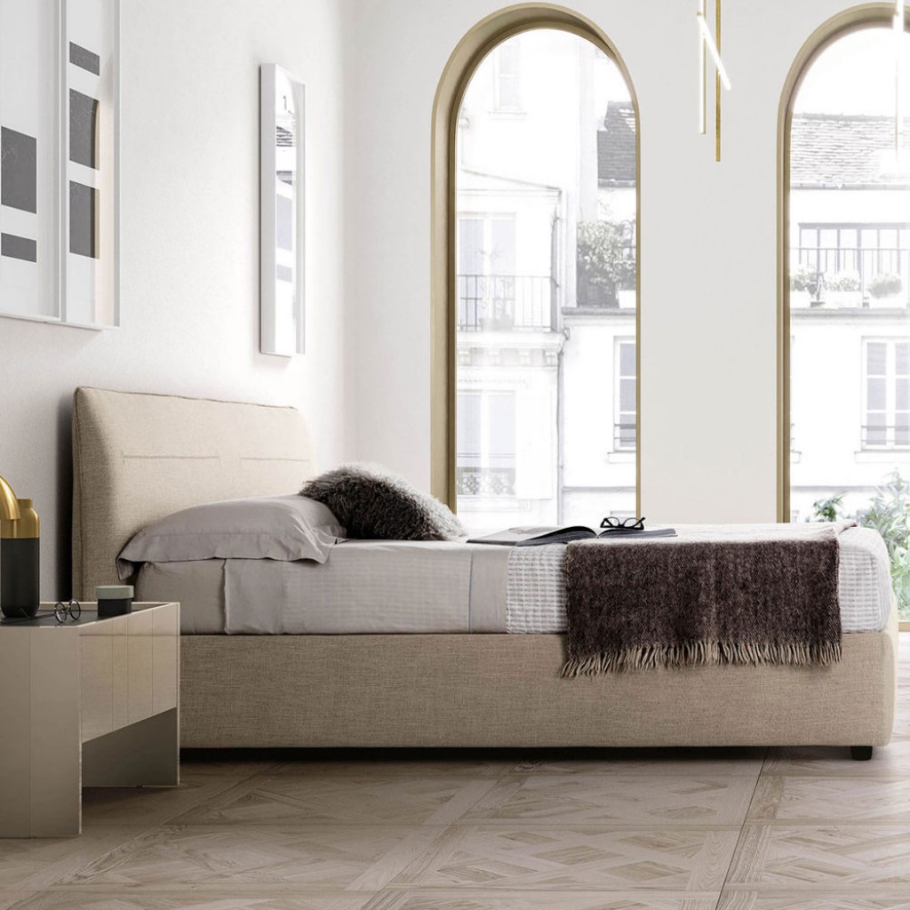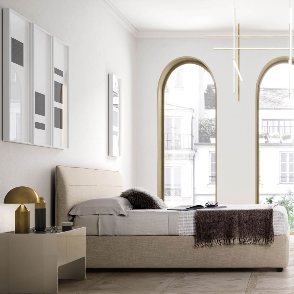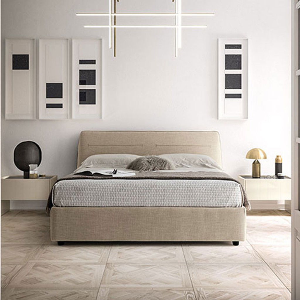 Patul matrimonial Fluffy se deosebeste prin sobrietate si simplitate liniara. Salteaua pare suspendata desi aceasta se sprijina pe o structura usoara, dar robusta, asezata pe picioare subtir.. -