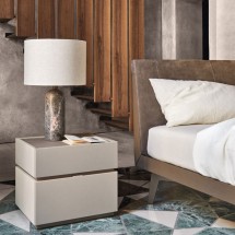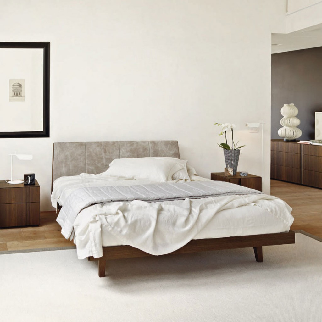 O combinatie de mobilier pentru zona de dormit. Un pat a carui tablie generoasa aminteste de ideea de perna moale. Design – Stefano SpessottoDimensiuni disponibile la cerere.. -