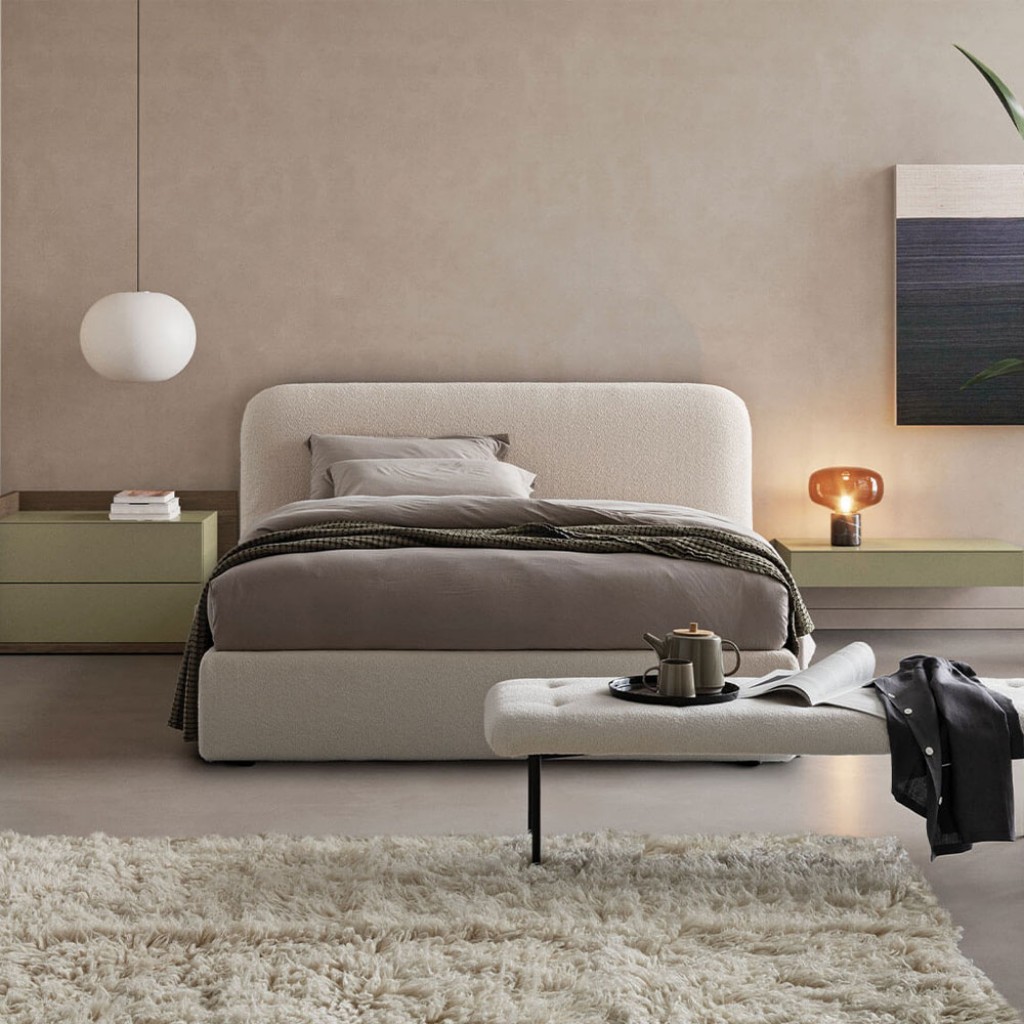Pat dublu tapitat cu material textil, piele sau piele ecologica pentru a fi personalizat intr-o gama larga de finisaje, marca Dall’Agnese. Tablia lata si moale poate fi protagonista si evidentiata ca impunatoare cu un container de baza sau facuta mai zvelta cu picioare.