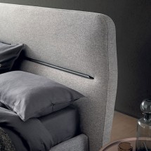 Tablia extinsa a patului tapitat Slit are un decor de impact, in comparatie cu cadrul de pat mai mic. De la inaltime se inclina pentru a scoate in evidenta insertul orizontal, un element artizanal, imbracat in piele sau vopsit in finisajele de lemn specifice Dall’Agnese.