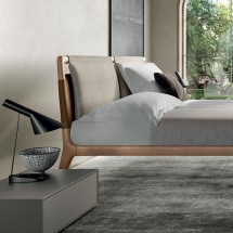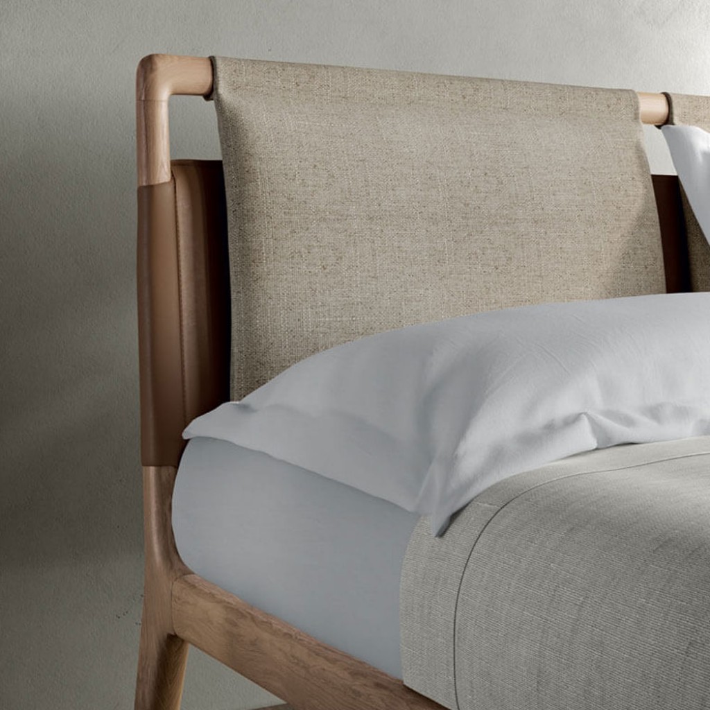 Incrucisarea liniilor si a materialelor. Este cel mai simplu mod de a descrie designul patului Dall’Agnese Tepu. Cele doua perne din spuma cu memorie ale tabliei se suprapun pe structura din lemn, unite printr-o banda orizontala de piele.