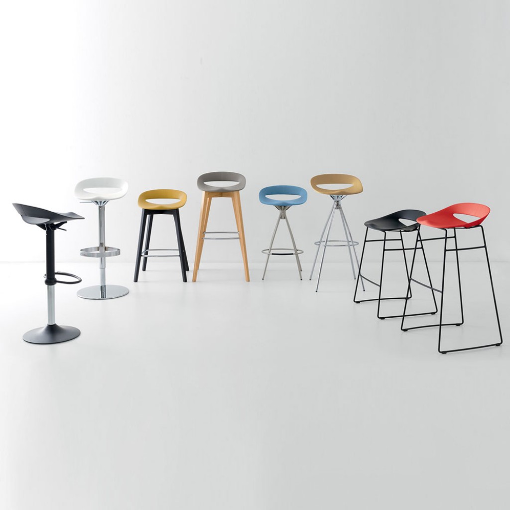 Scaun pentru bar cu baza pivotanta, in diferite tipologii, cu picioare sau baza rotunda metalica.Dimensiuni:Inaltime - 45 / 40-52 / 72 / 53-79 cm.. -