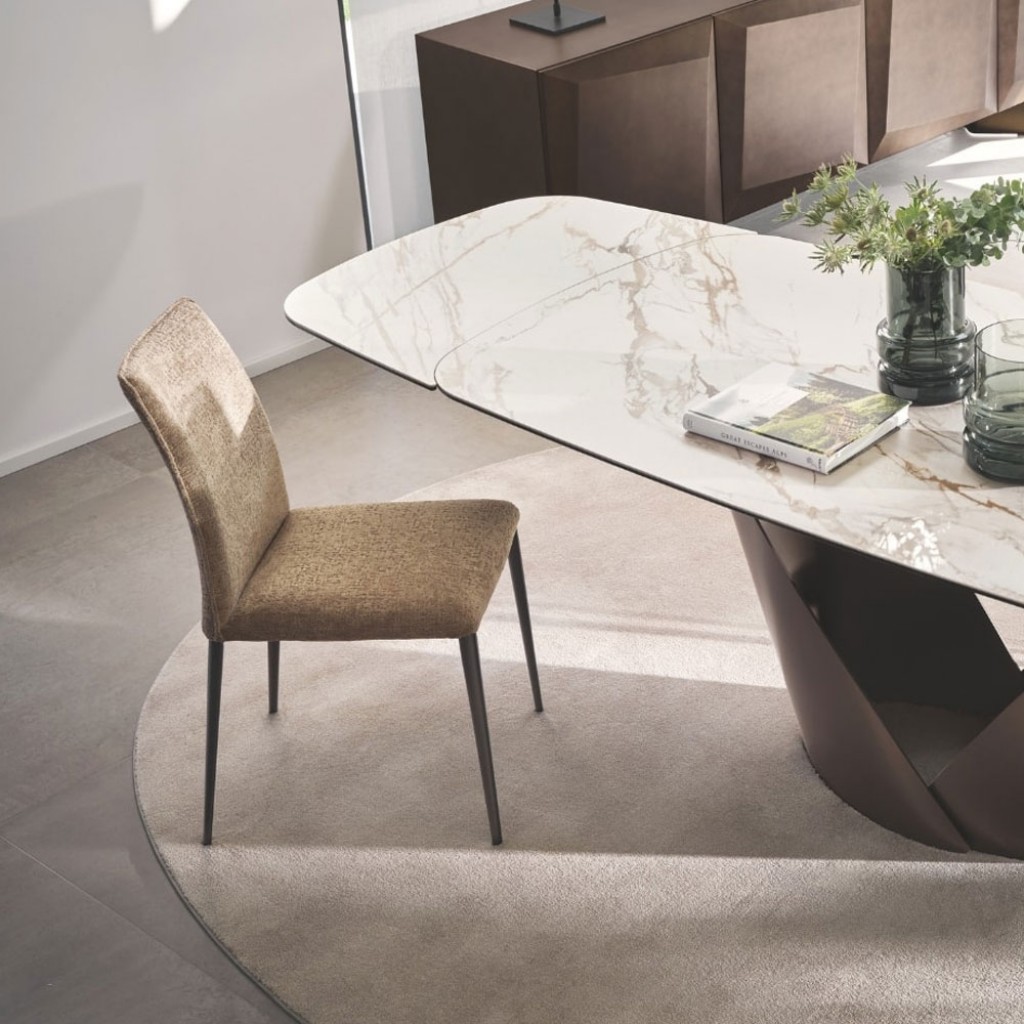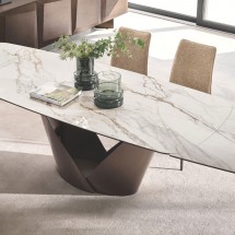 Silhouette este o masa extensibila cu un design sofisticat, minimalist, cu margini usor rotunjite si un cadru subtire din aluminiu acoperit. Blatul este disponibil in lemn sau ceramica, cu m.. -