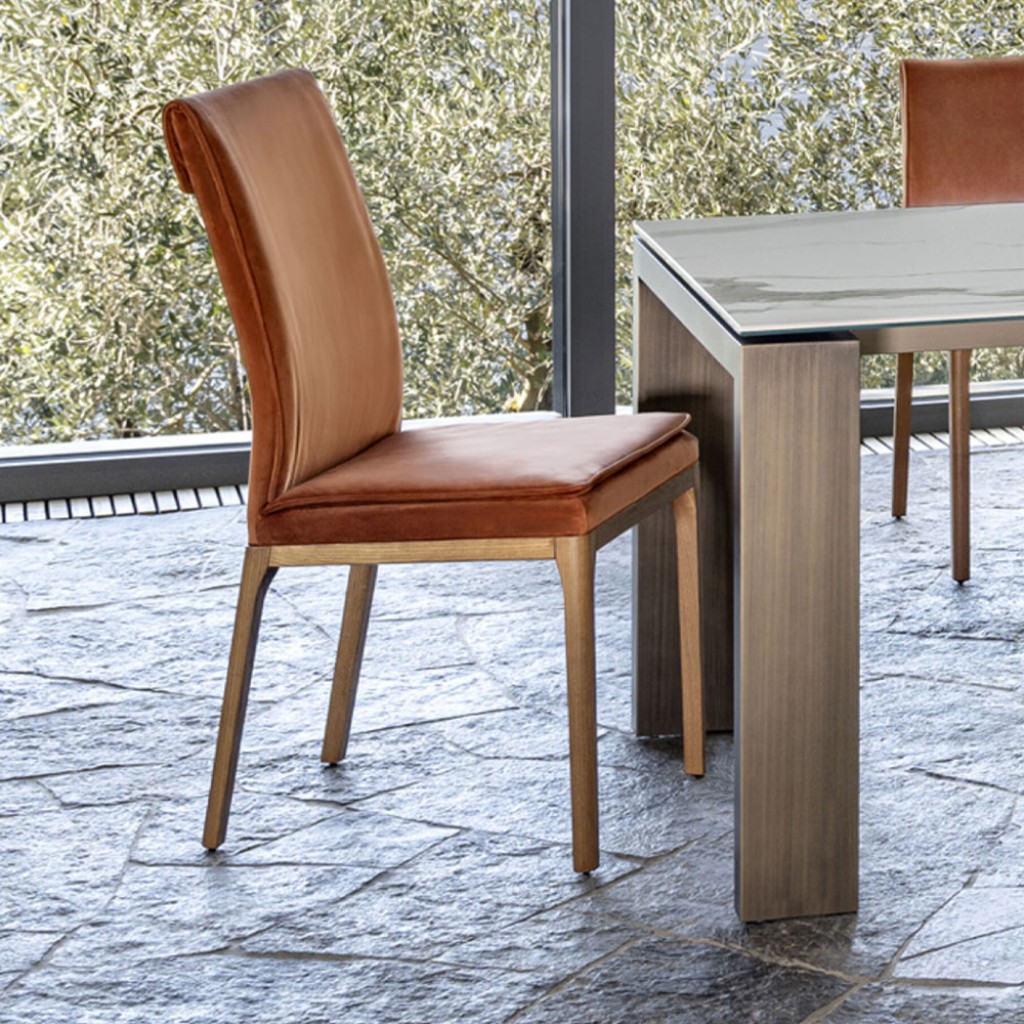 Bess dispune de cadru din lemn si scaun tapitat, acoperit cu piele. Impreuna cu versiunea superioara, Bess Low va deveni protagonistul zonei dumneavoastra de luat masa. Picioarele si partile.. -
