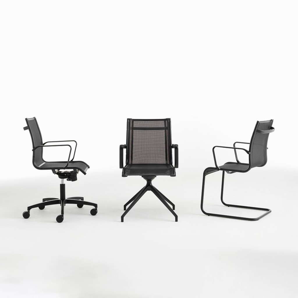 Intalnirea dintre linii usoare si forme fluide. Un scaun operativ structurat si distinct, cu sezut tapitat si spatar din mesh, cu structura disponibila in alb sau negru, completata de brate,.. -