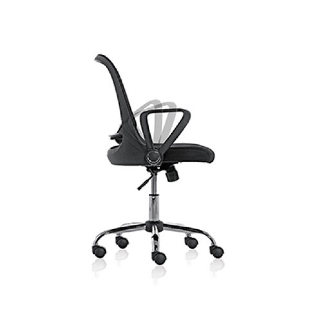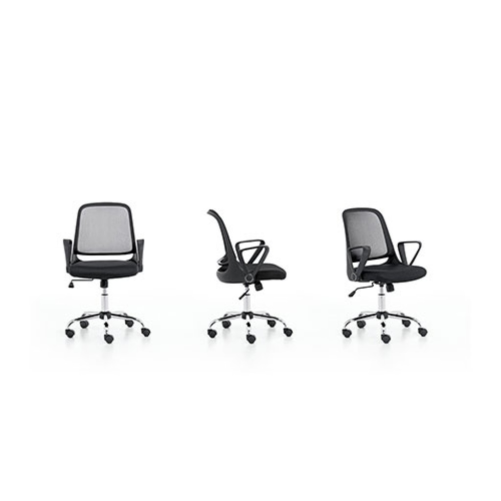 Un scaun de birou, un model conceput pentru nevoi de functionalitate. Cotierele pot fi pliate printr-o simpla rotatie a acestora.
