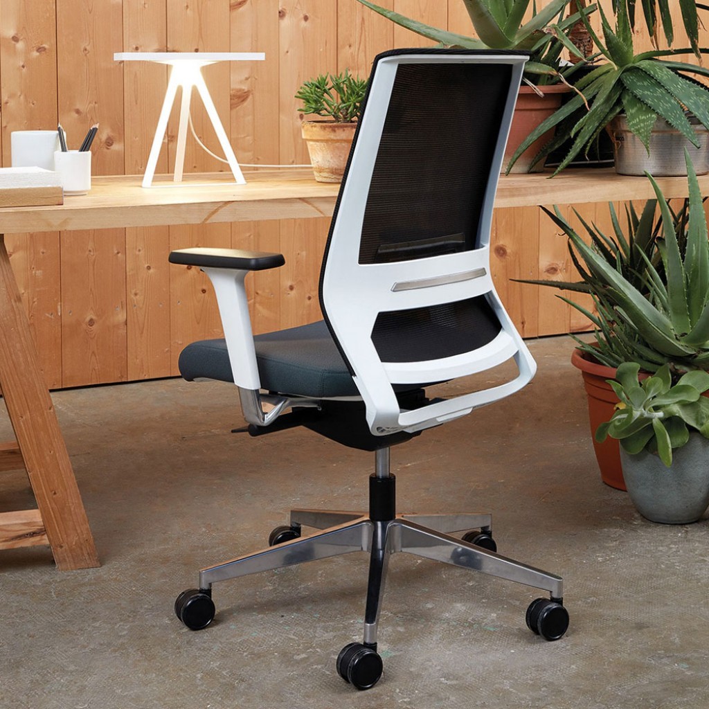 Intalnirea dintre linii usoare si forme fluide. Scaun operativ cu sezut tapitat si spatar din mesh, cu structura alba sau neagra si componente asortate.Dimensiuni.. -
