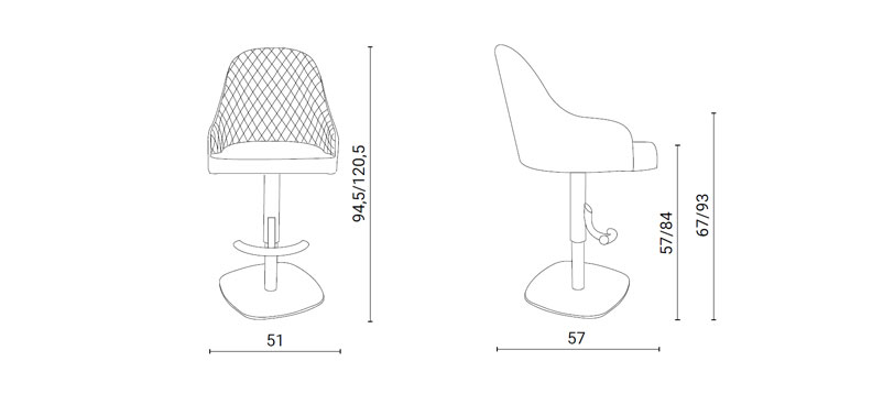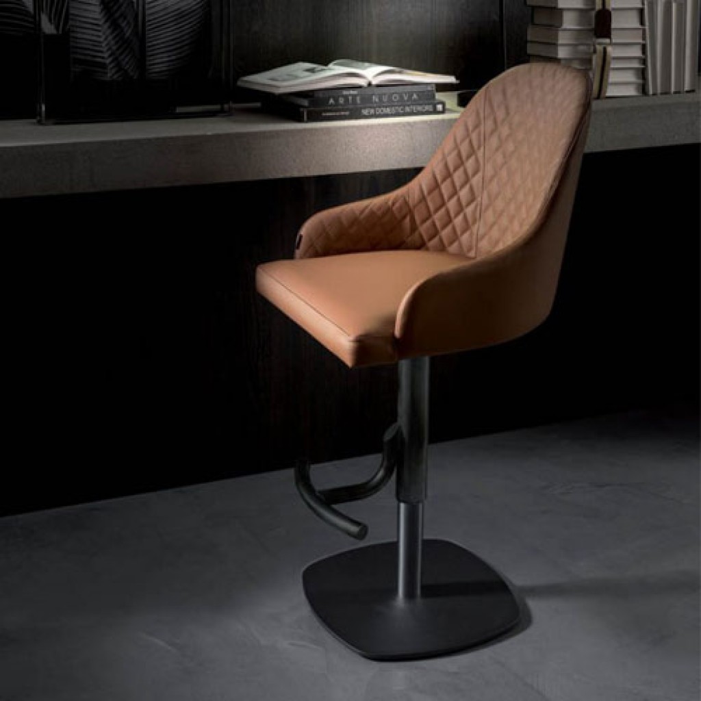 Scaun pentru bar cu dispozitiv de ridicare, acoperit cu piele moale, piele eco nabuk sau catifea si structura metalica. Pe partea interioara a scaunului vine cu model matlasat.