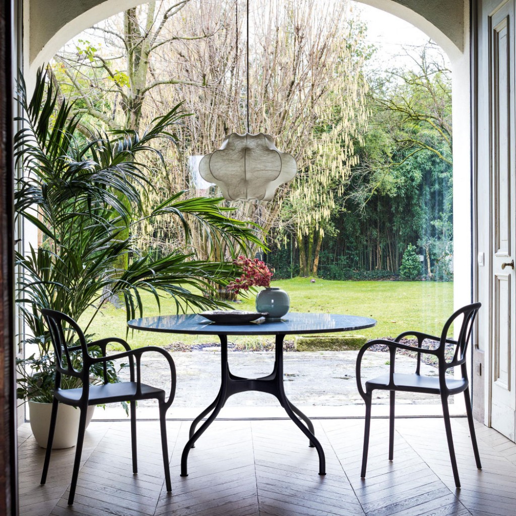Designer Konstantin GrcicMateriale folosite: cadrul din fonta vopsit in pulbere de poliester, suprafata din marmura carrara sau marquinia. Poate fi ultilizata si la exterior.Dimensiuni:.. -