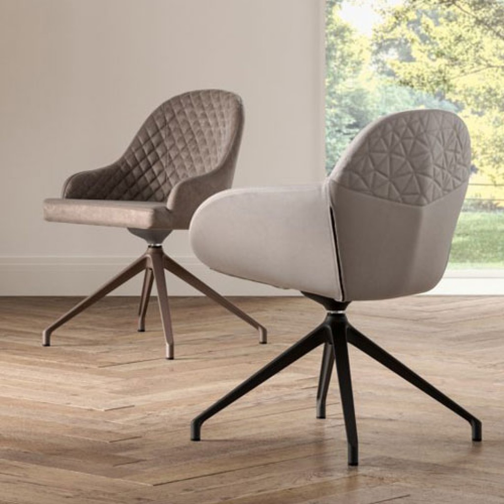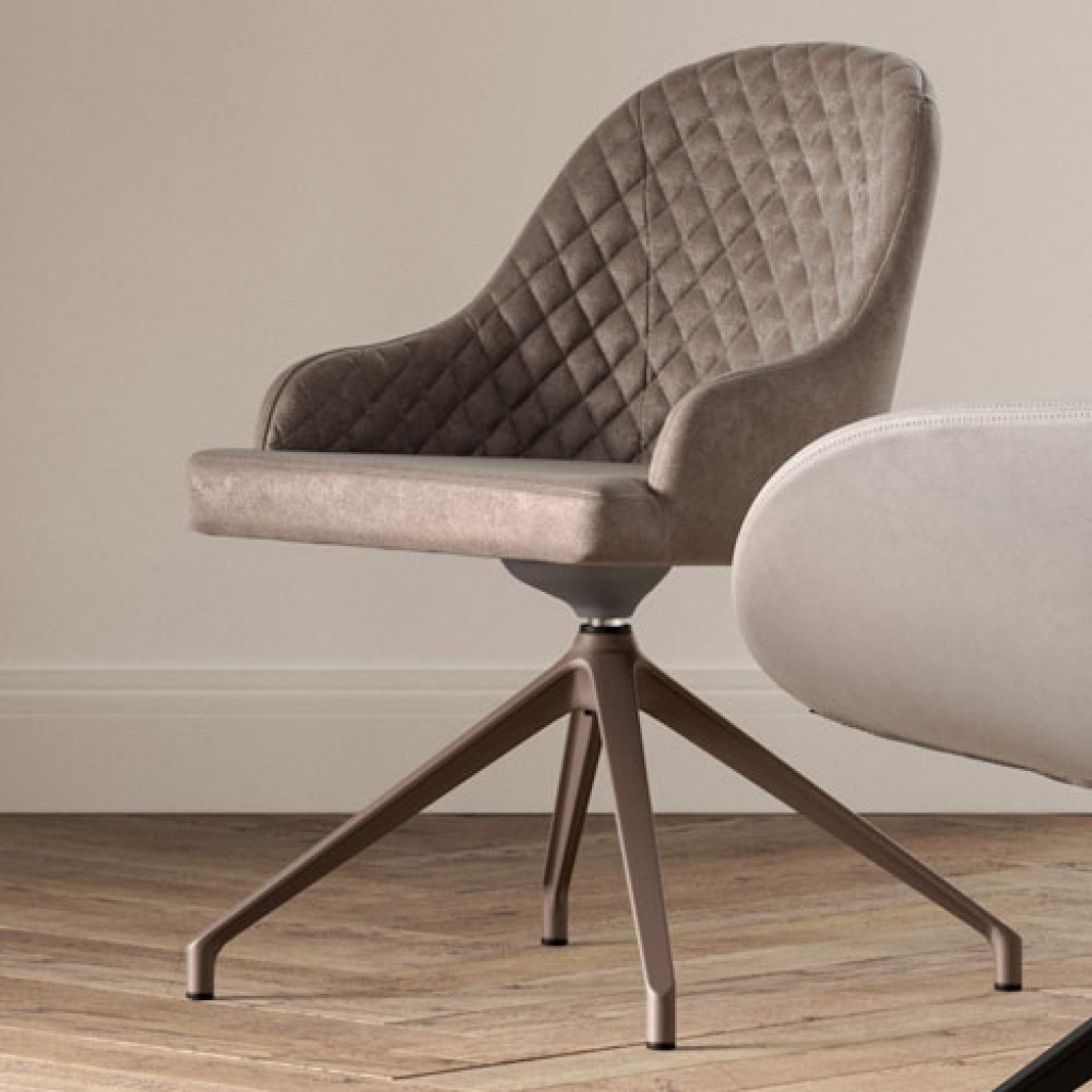 Fotoliu pivotant cu baza metalica, acoperit cu piele moale, piele ecologica sau catifea si interior cu model matlasat.