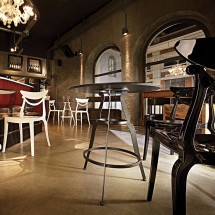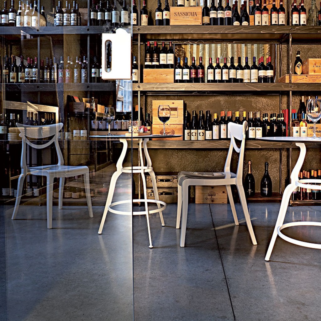 Estrosa este un scaun pentru bar cu rama din otel vopsit in culori epoxidice sau cromate, in doua variante de inaltime, cu posibilitate de stivuire.Designer Setacomincini.. -