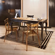 Pentru acest model de masa pentru dining materialitatea calda a blatului din lemn vine in contrast cu cadrul compus din doua tuburi curbate, legate in partea inferioara cu placi metalice. Es.. -