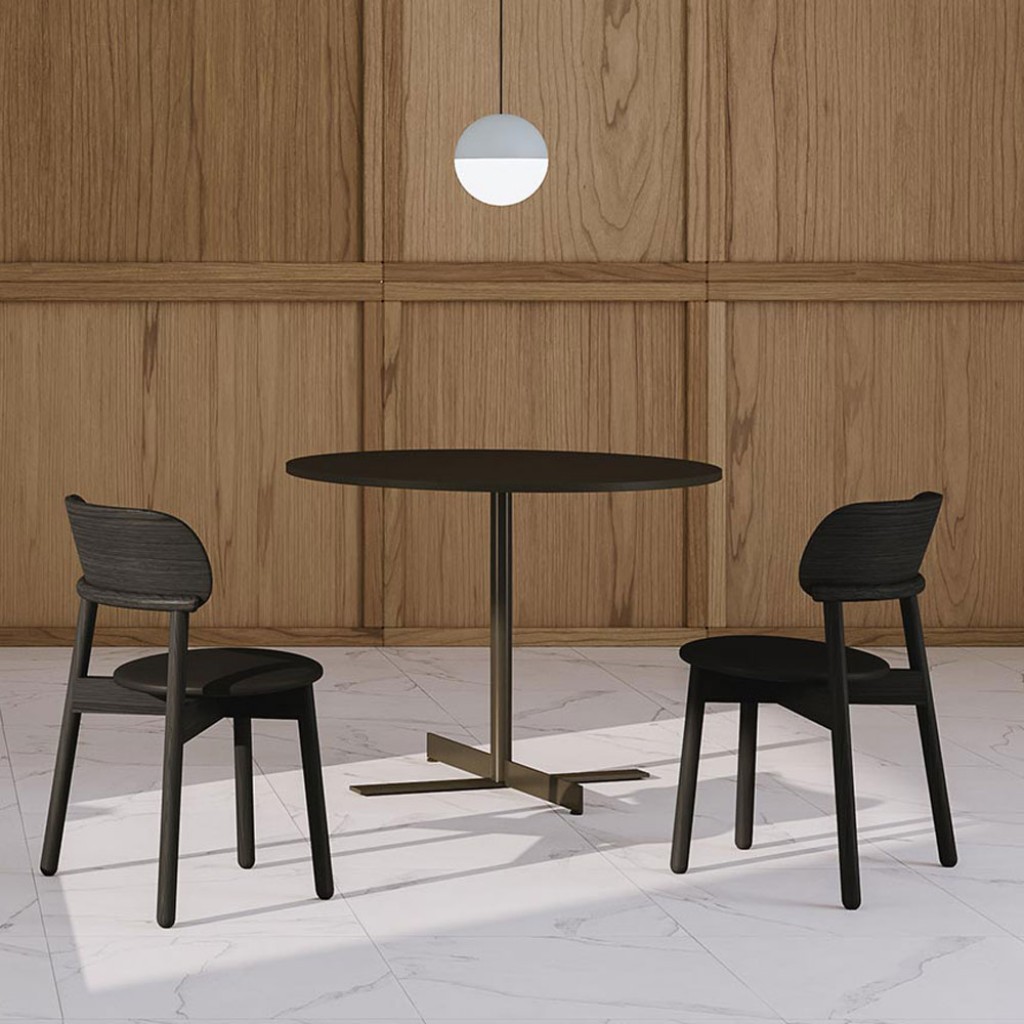 Pentru acest model de masa pentru dining materialitatea calda a blatului din lemn vine in contrast cu cadrul compus din doua tuburi curbate, legate in partea inferioara cu placi metalice. Es..